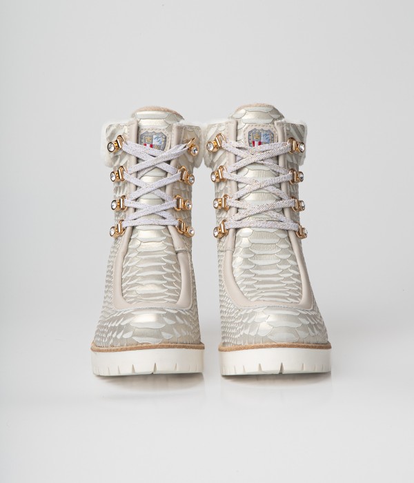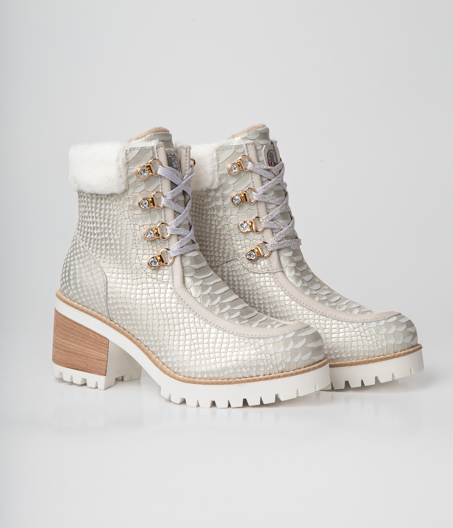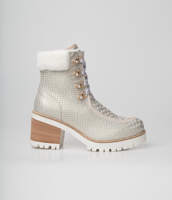 Stiefelette aus perlfarbenem Leder mit Reptileffekt. Kragen aus Kunstfell. Schnürung mit glänzendem Stein.