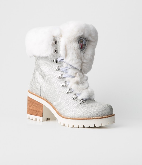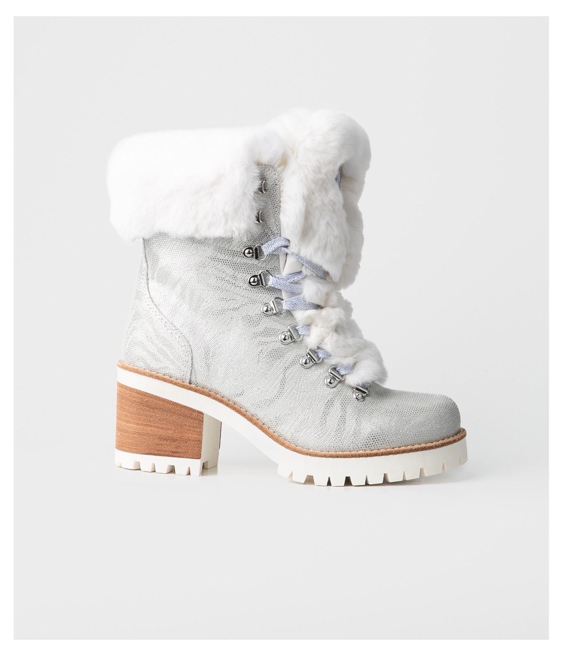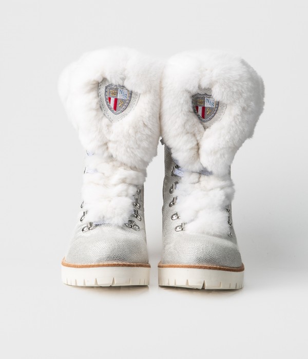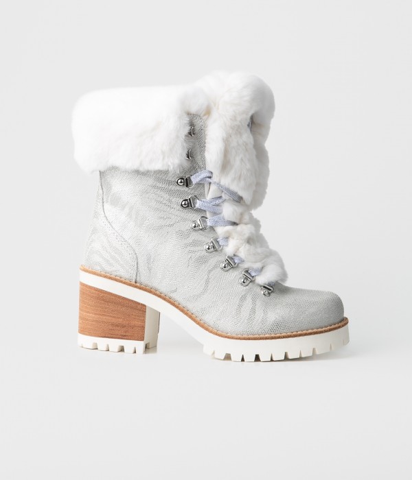 Stiefelette aus laminiertem, geprägtem Leder mit Rex-Kaninchenfell-Akzenten.