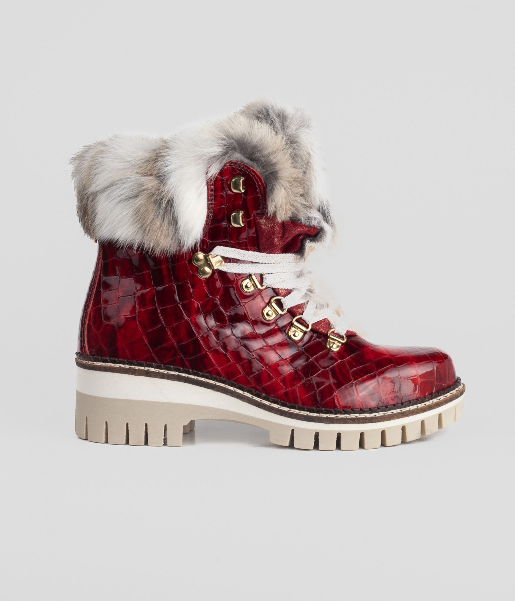 Stiefelette aus rotem Leder und beige gestreiftem Fell