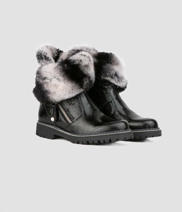 Stiefel aus schwarzem Lackleder mit Reißverschluss und Fellkragen.