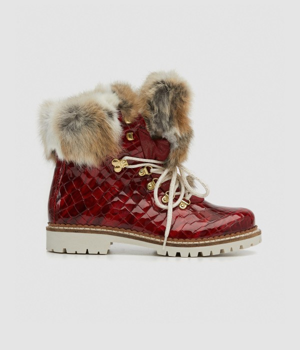 Schnürstiefelette aus taupefarbenem Lackkalbsleder mit „Kroko“-Prägung und beige-weiß schattiertem Schaftkragen aus Kaninchenfell. Das Futter aus warmem Gewebe und die Innensohle aus reiner Wolle verleihen Ihrem Fuß umfassenden Komfort. Die Sohle besteht aus Gummi und hat eine Höhe von 3 cm. Die Gesamthöhe der Stiefelette beträgt 18 cm bei einem Knöchelumfang von 26 cm (Mindestgröße)