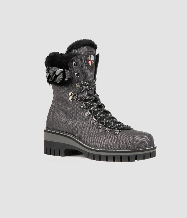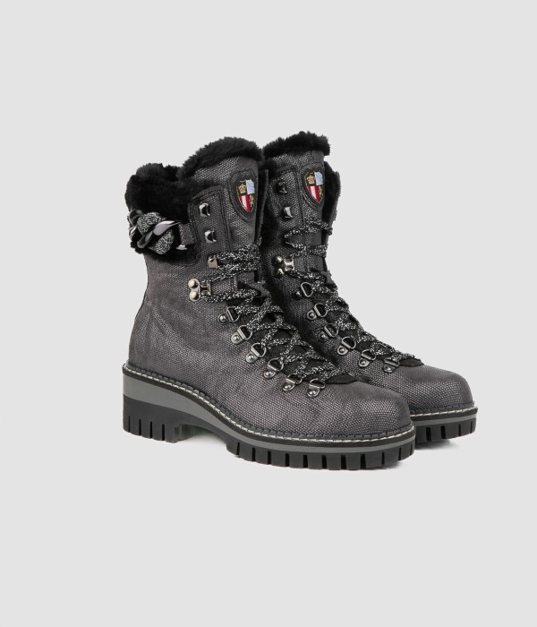 Anthrazit Grau Lederstiefelette mit Kunstfellkragen und dekorativem Accessoire.