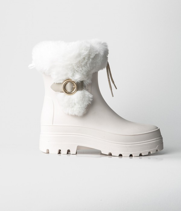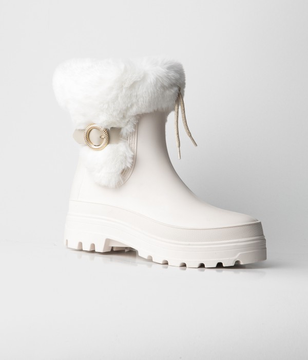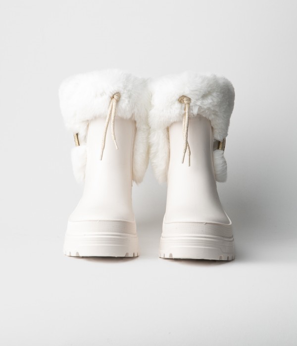 Dieser weiße Gummistiefel ist mit Details aus Kunstfell verziert.