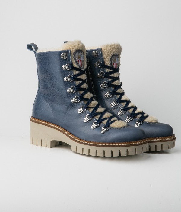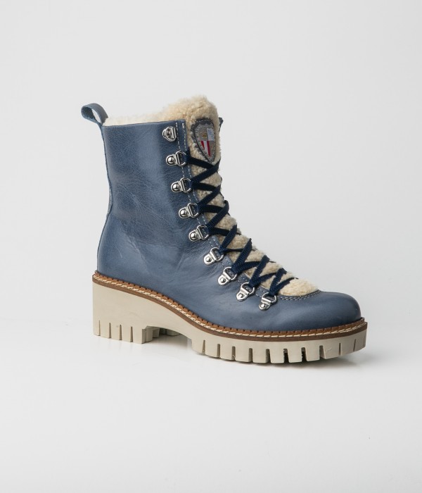 "Trekking Chic" Stiefelette aus Staubblaufarbenem Pull-Up-Leder und Curly Shearling.