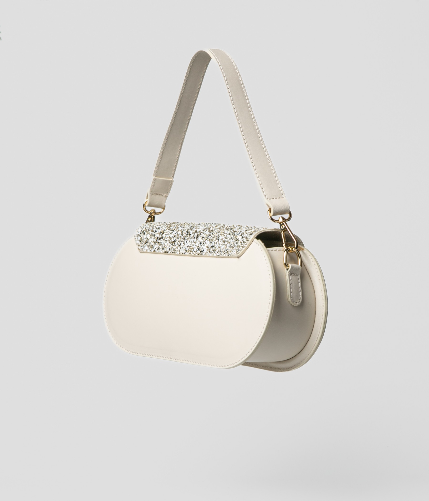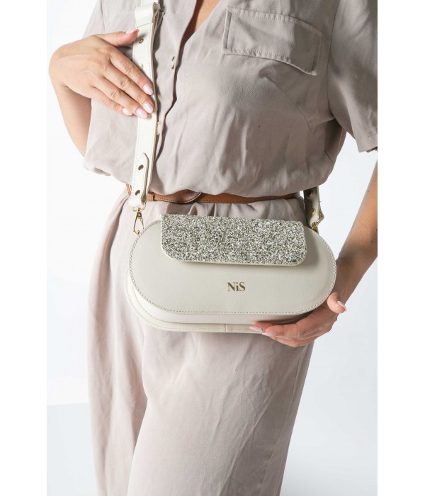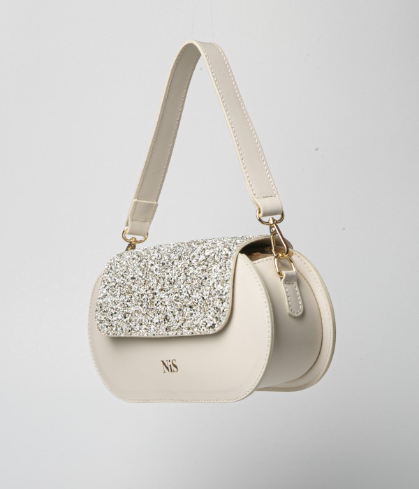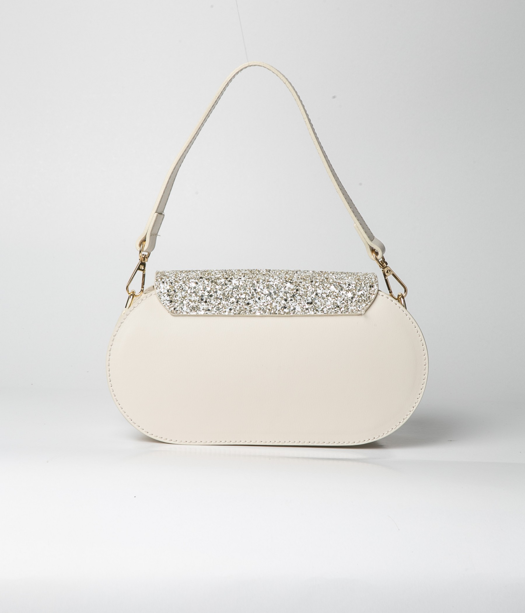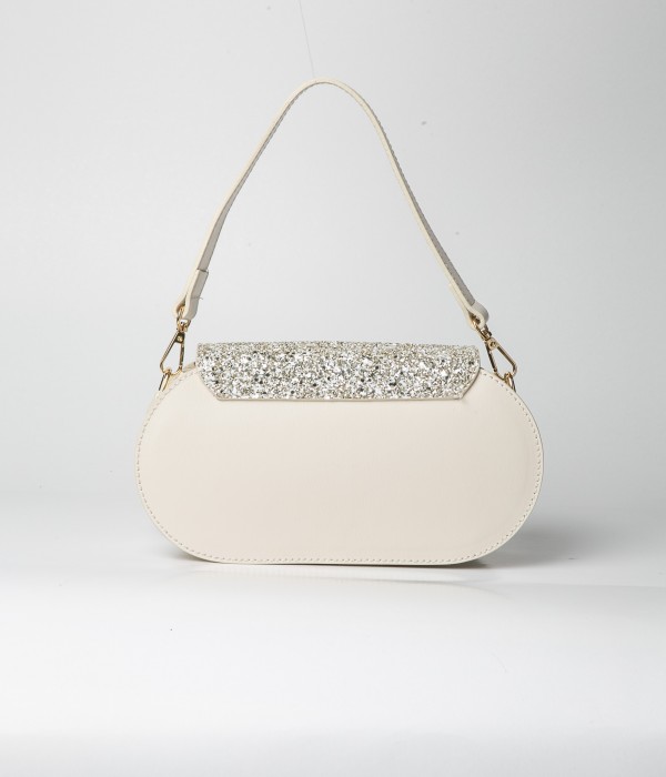 Tasche aus Milchleder mit Überschlag aus Glitzerstoff.