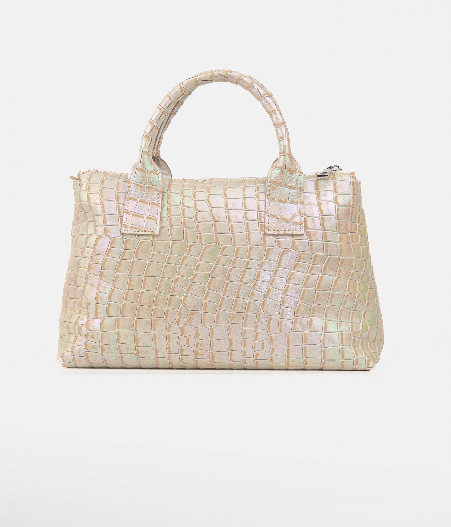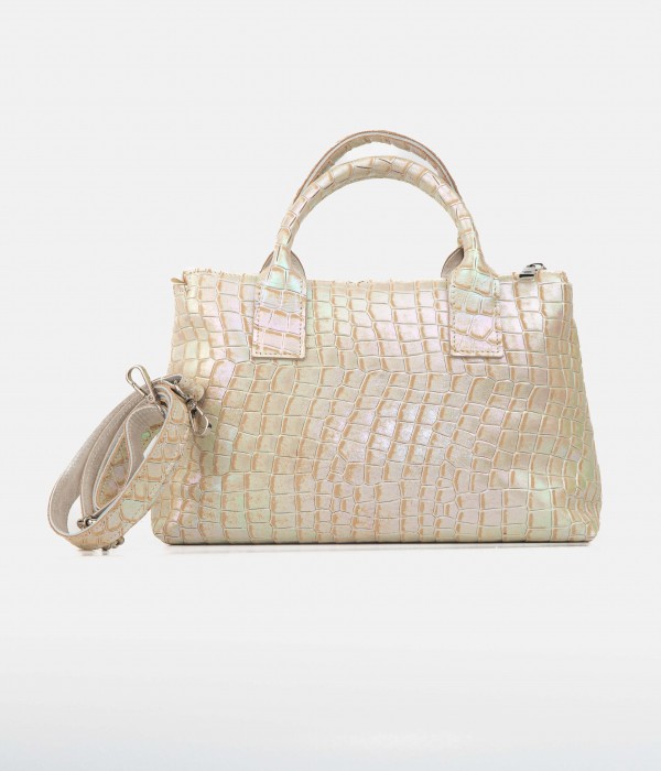 Das geschnitzte Leder mit Krokodilprägung hat einen gebürsteten Vintage-Look. Die schillernde Optik macht jeden Look zu etwas Besonderem.