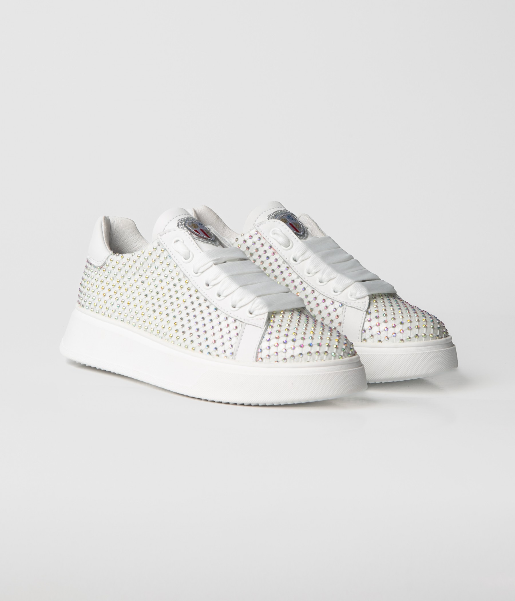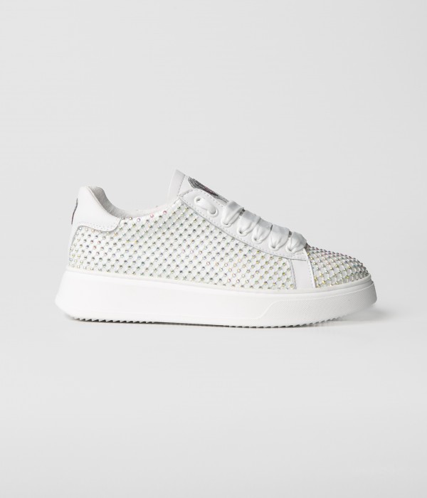 Casual-Chic-Sneakers kombinieren ein weißes Crystal-Mesh mit glatten weißen Ledereinsätzen.