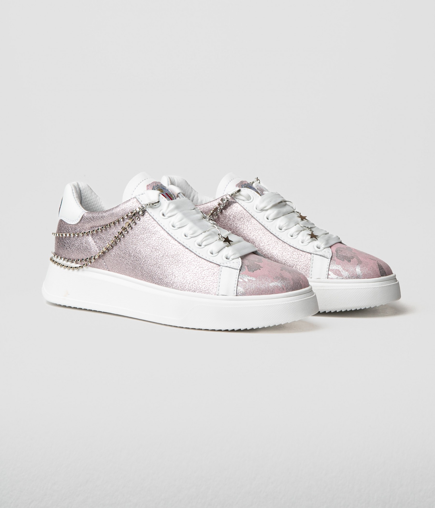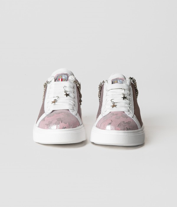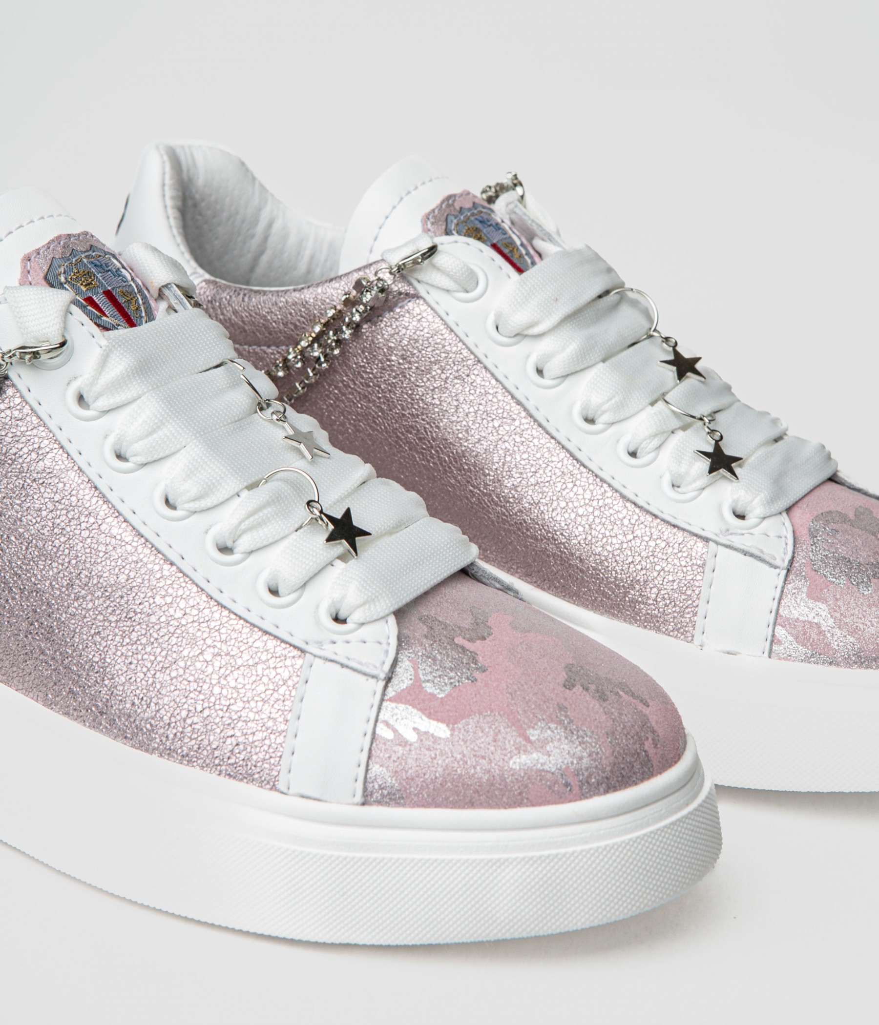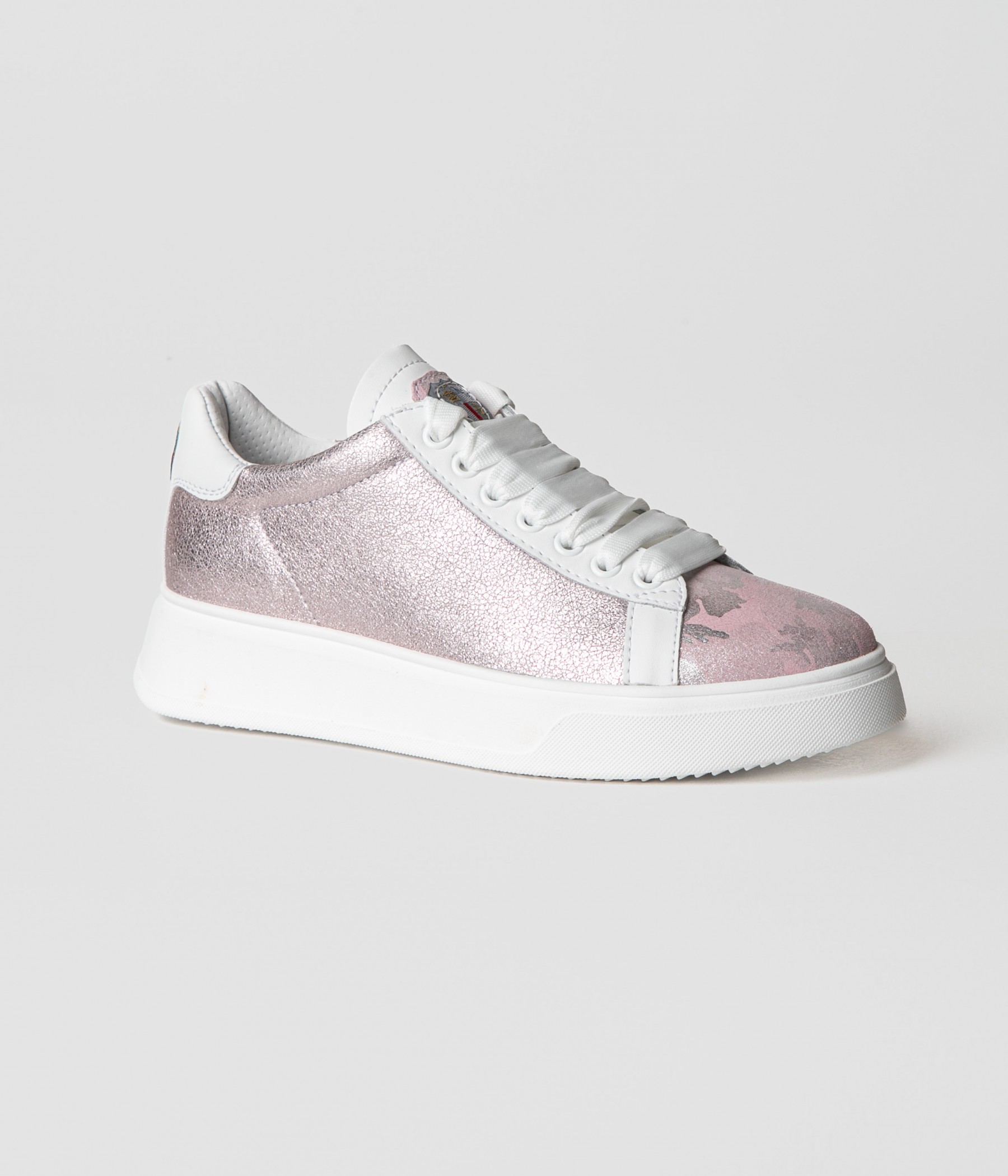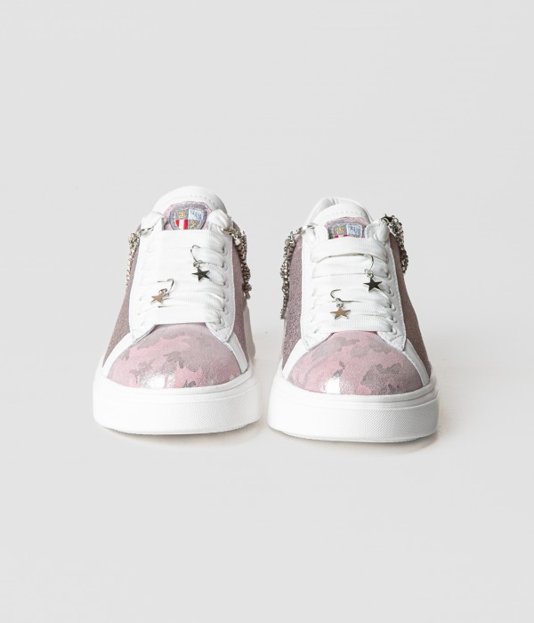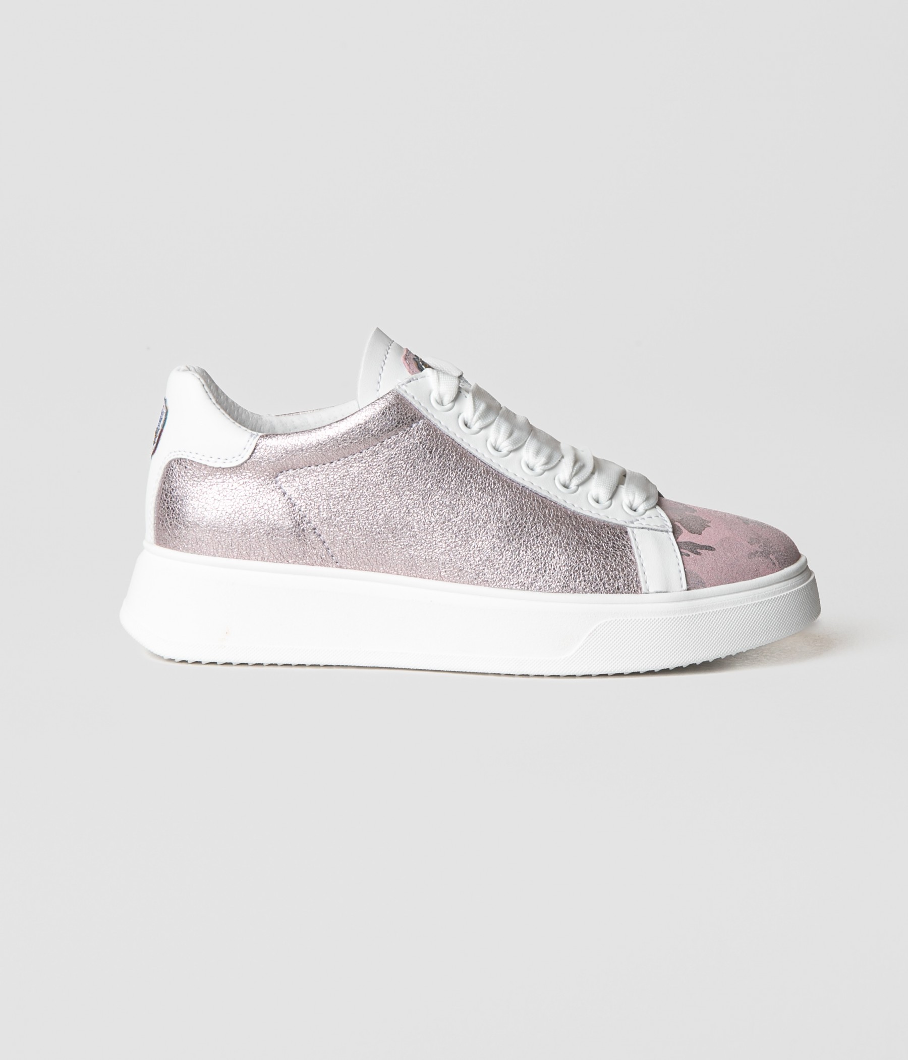 Made-in-Italy Sneakers aus echtem rosa laminiertem Leder. Die Einsätze an der Spitze sind aus Leder im Camouflage-Stil.