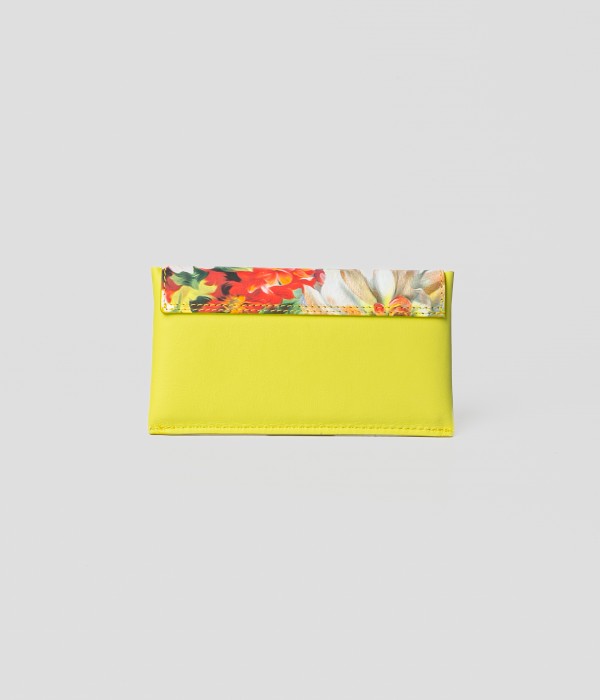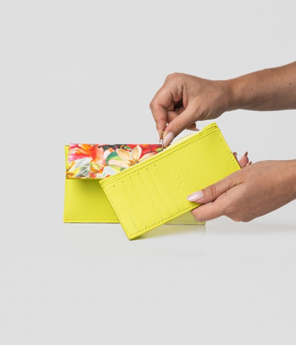 Wallet with removable card holder, in yellow/lime leather and floral carryover.