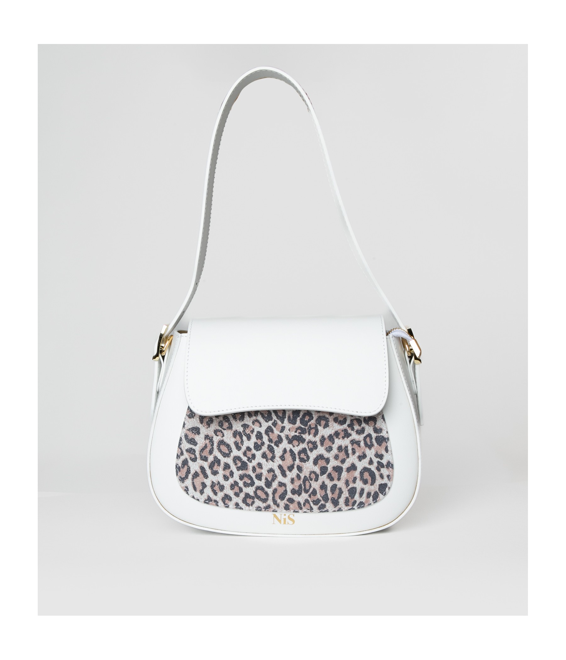 White leather bag with animal print carryover.
