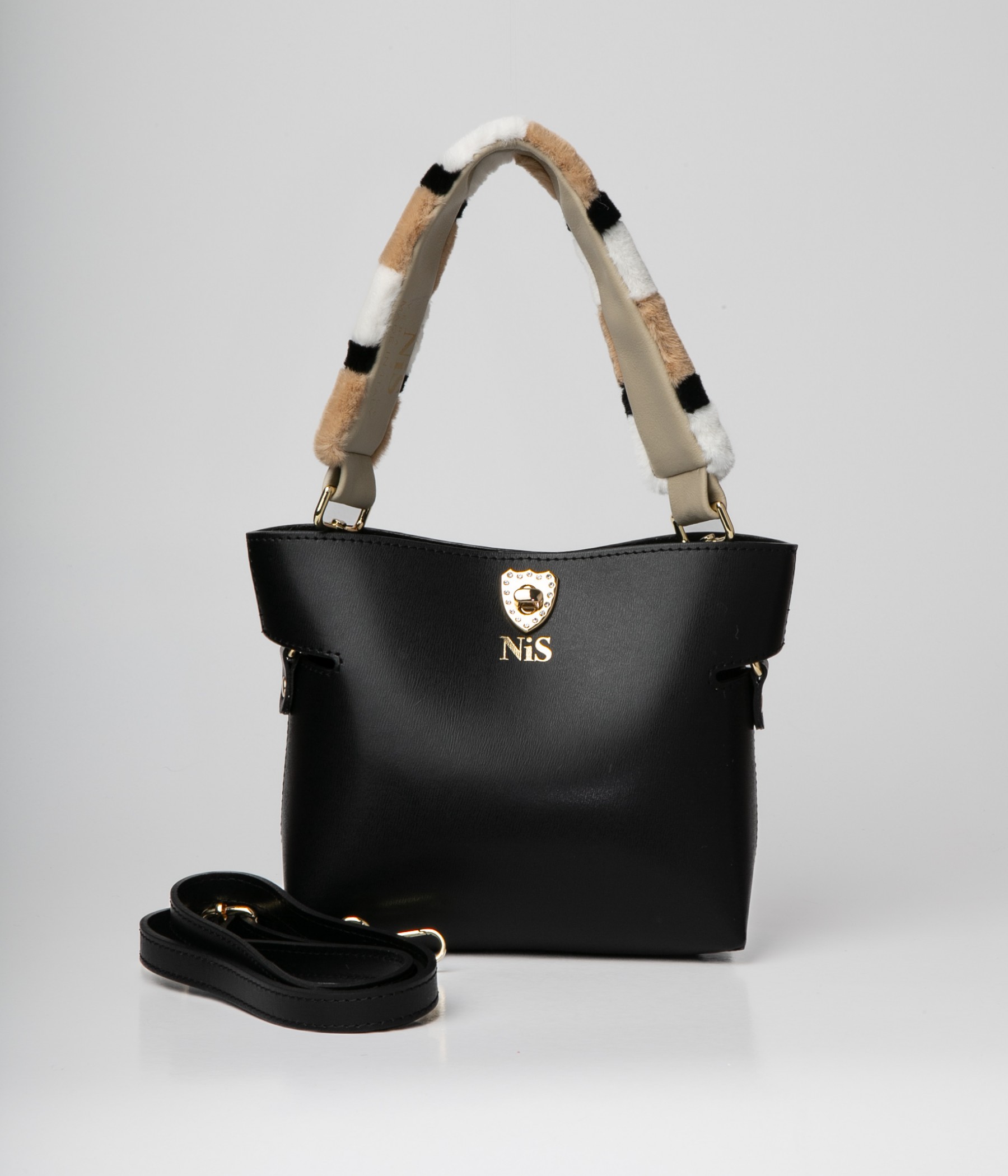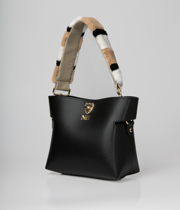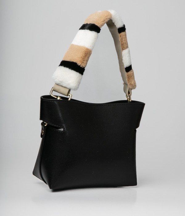 Black leather bag. Faux fur handle and adjustable leather shoulder strap.