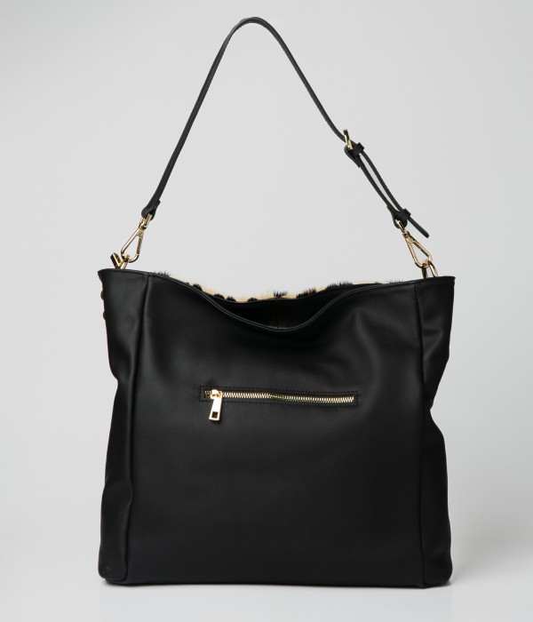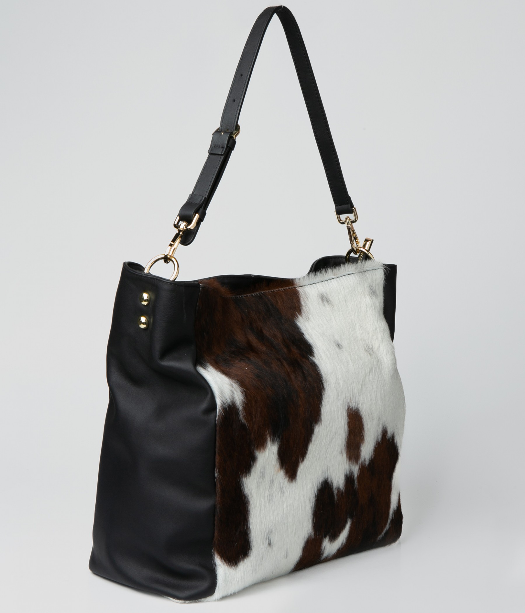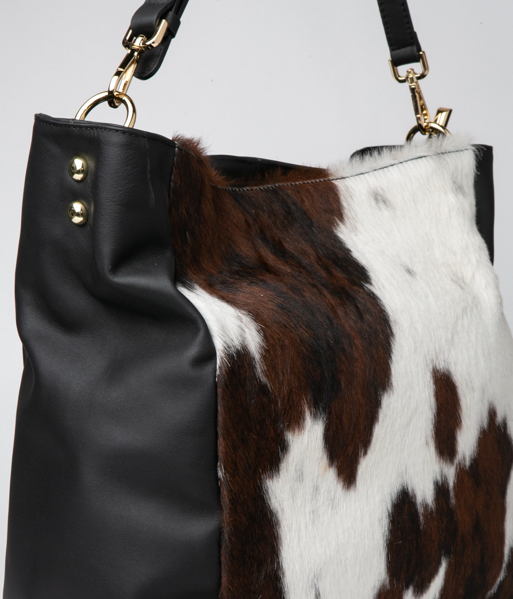 Capacious tricolor natural pony-effect leather shoulder bag.