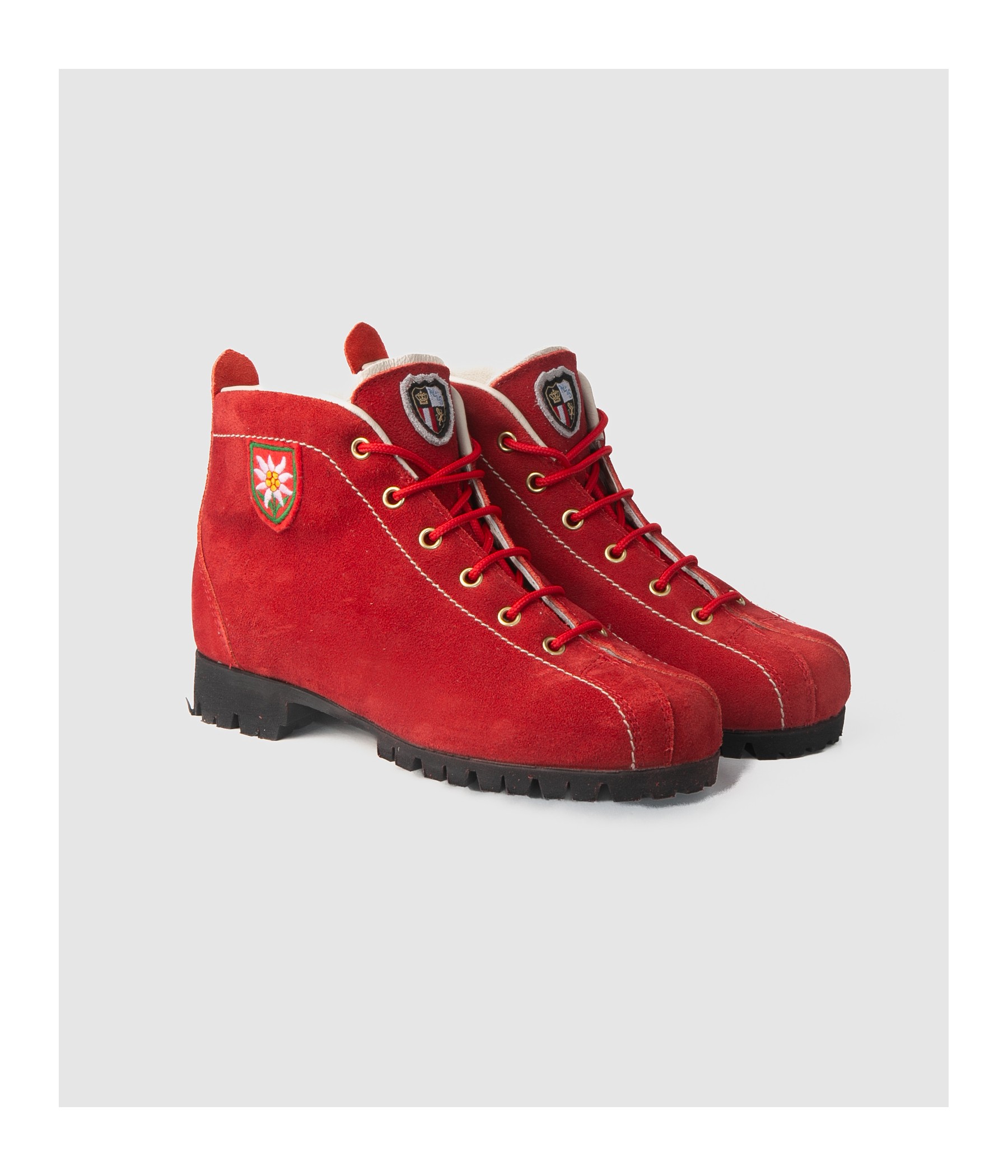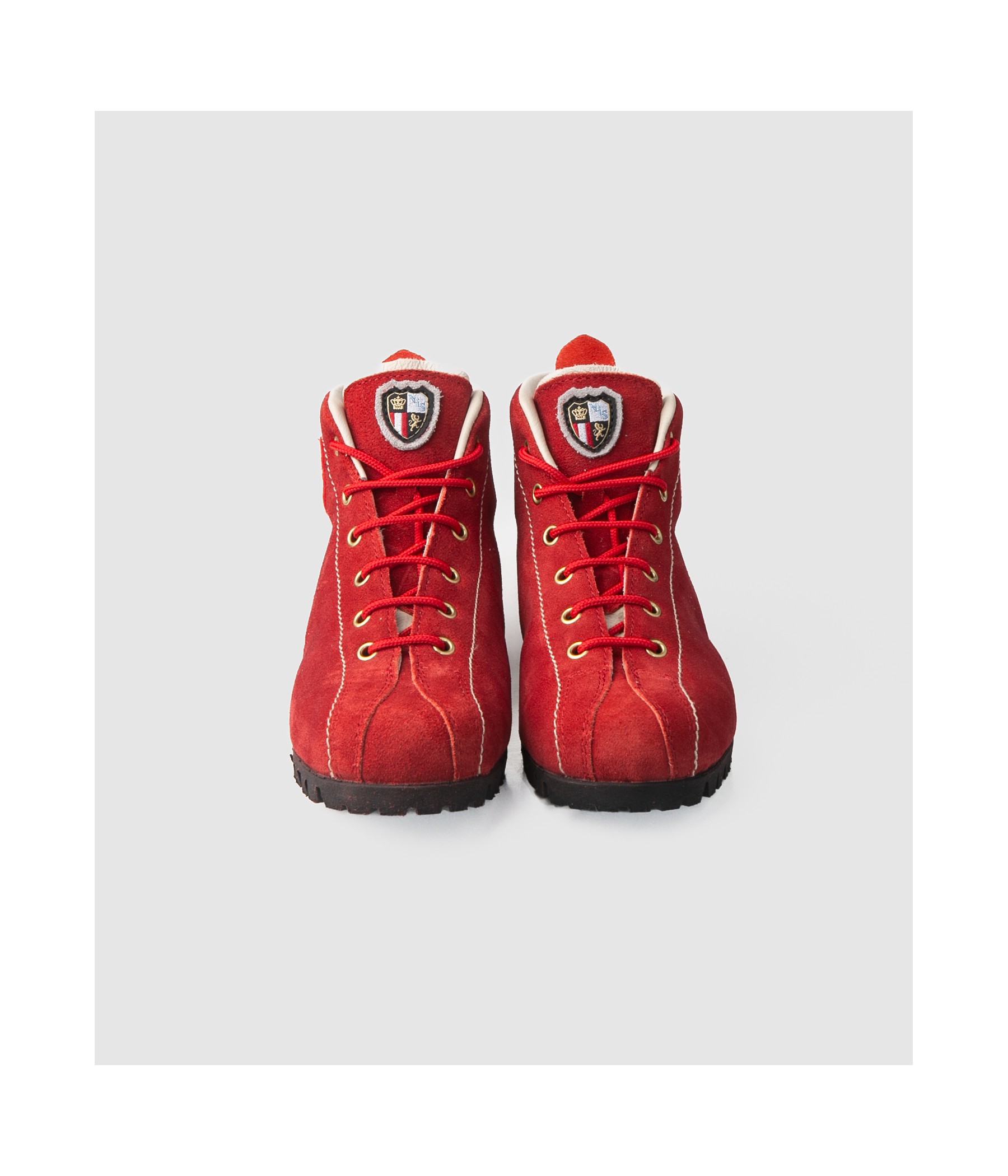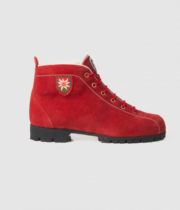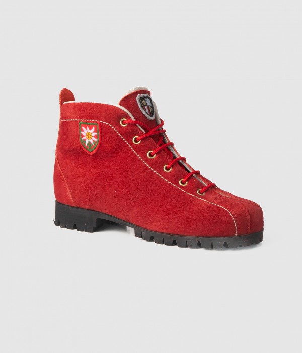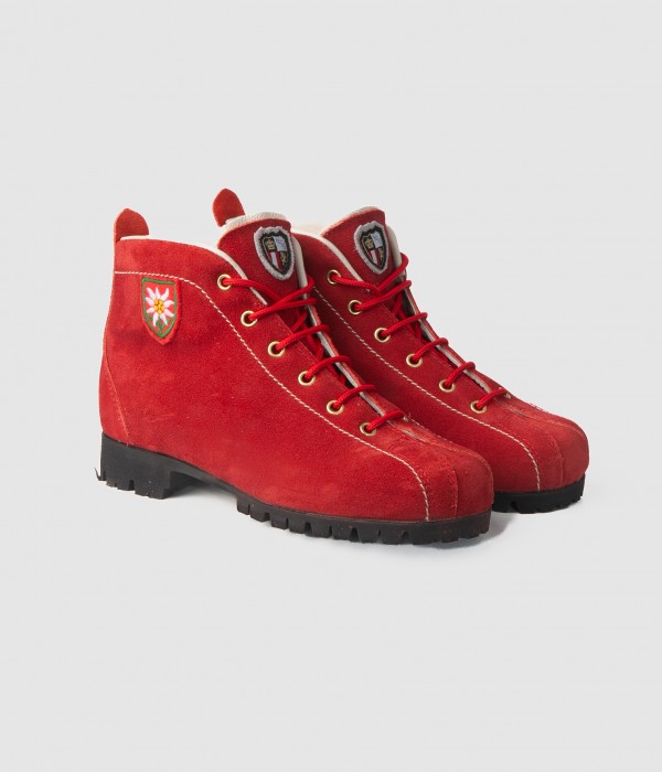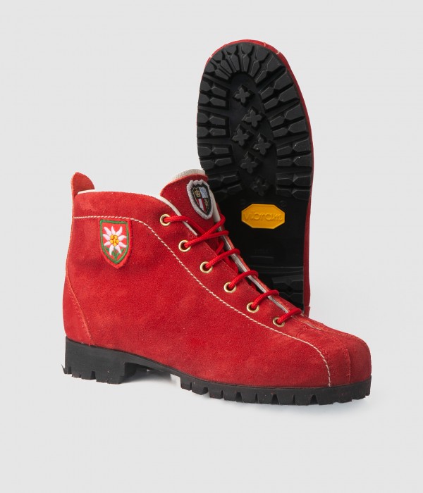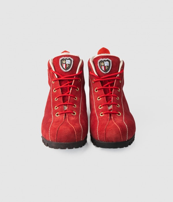 These red velour leather boots, featuring a classic design, are the ideal companions for leisurely outdoor excursions.