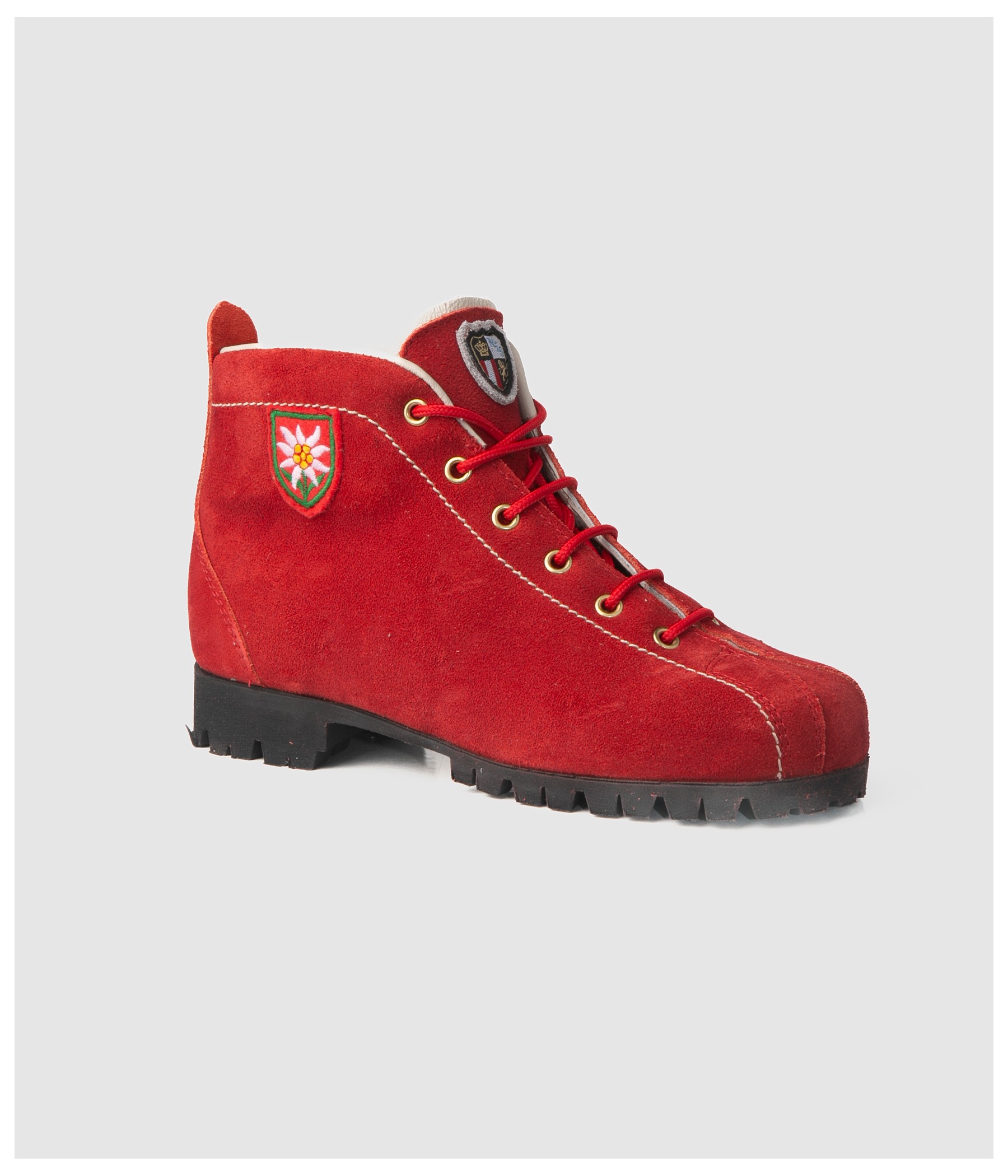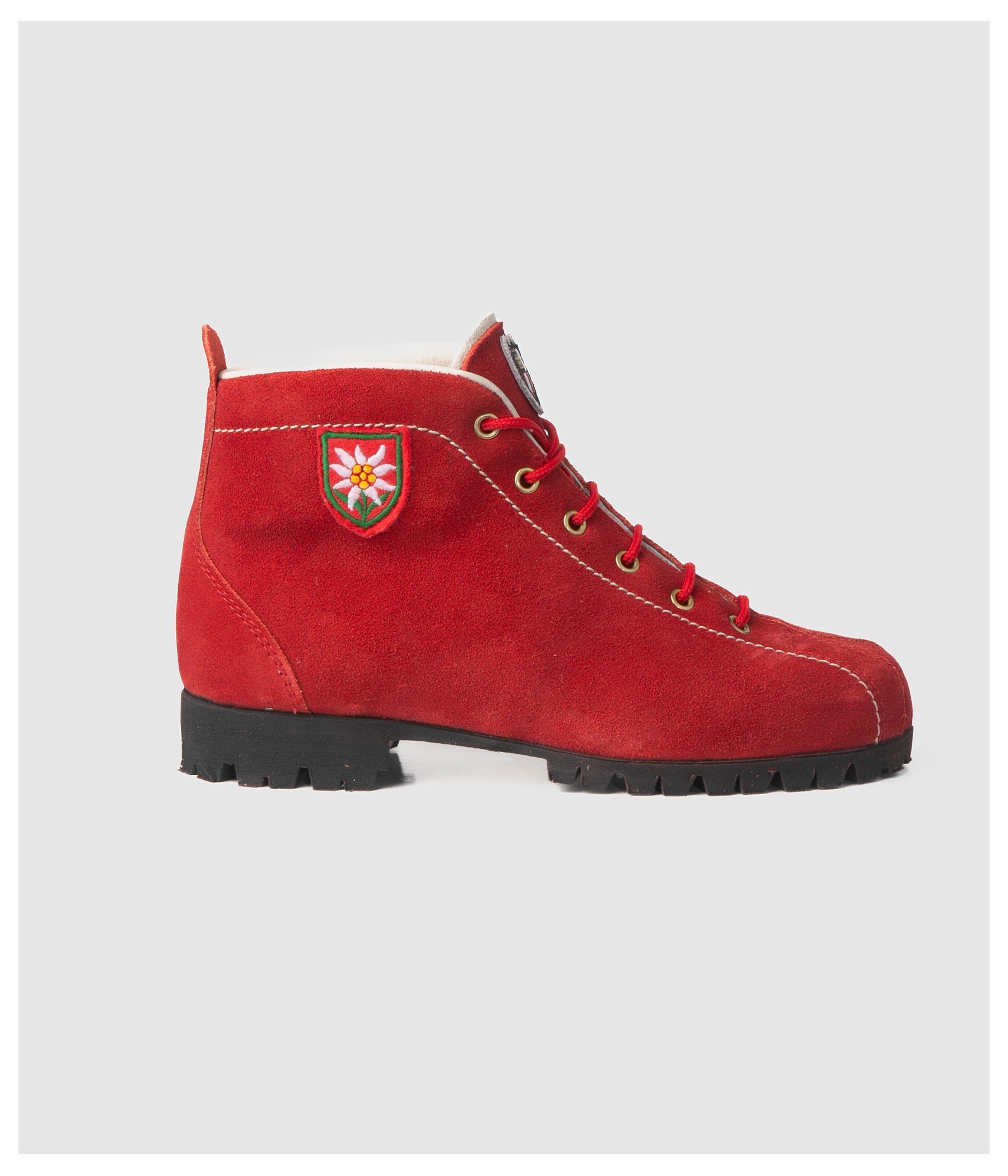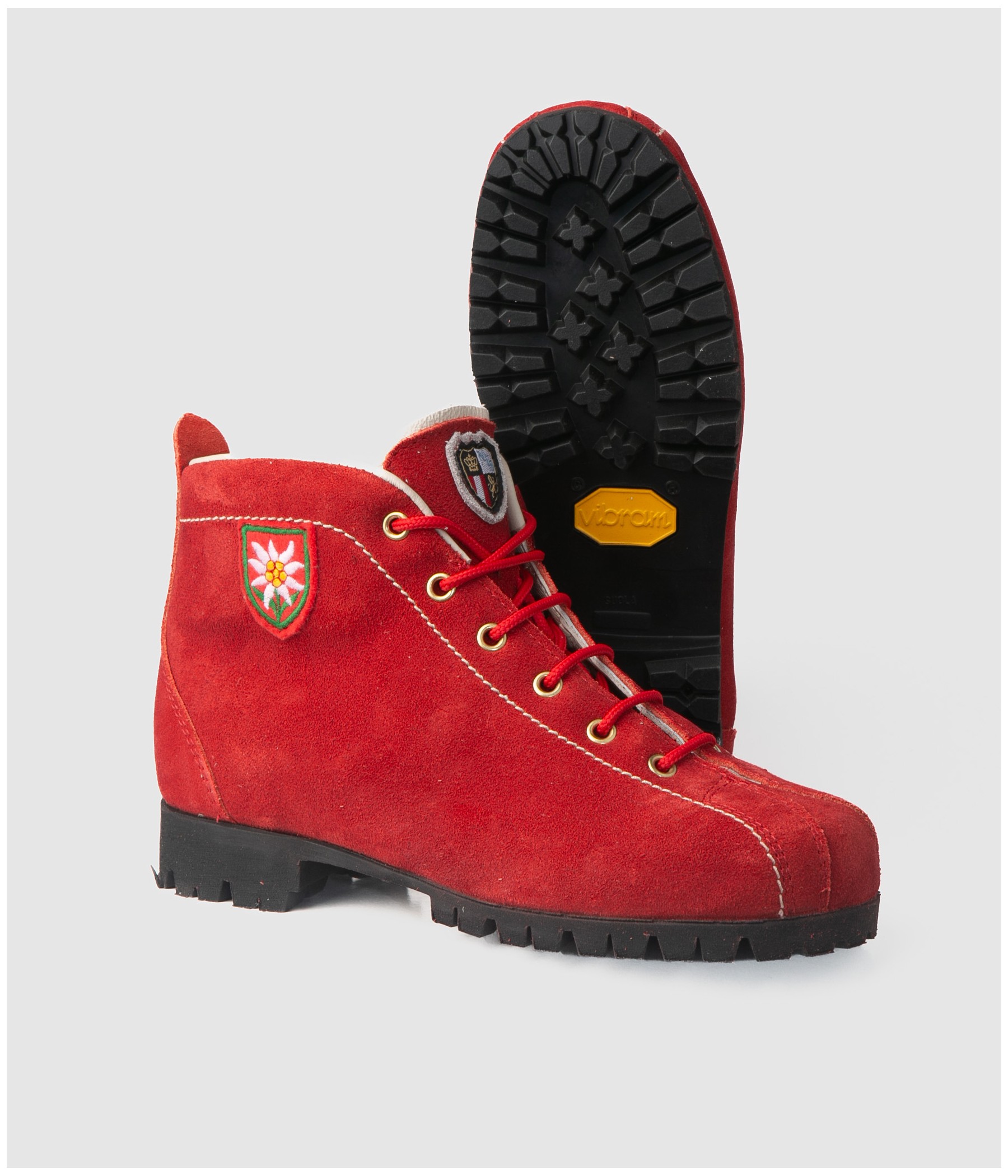 These red velour leather boots, featuring a classic design, are the ideal companions for leisurely outdoor excursions.