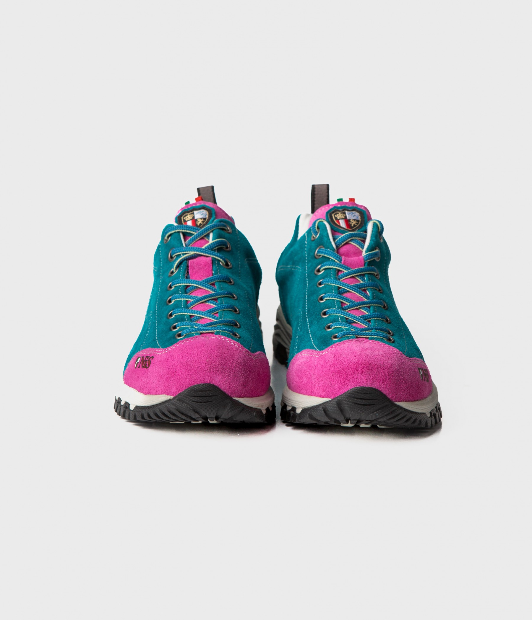 The acquamarin velour leather is enhanced by contrasting inserts, highlighting its audacious character and strong, gritty style.
