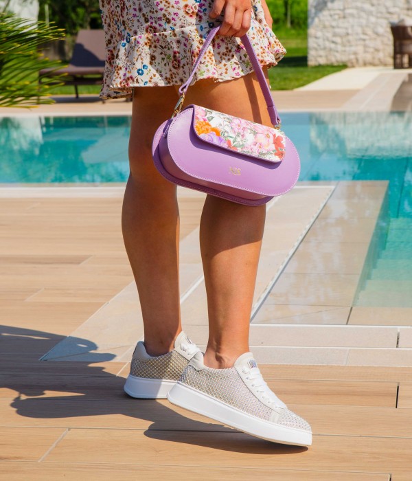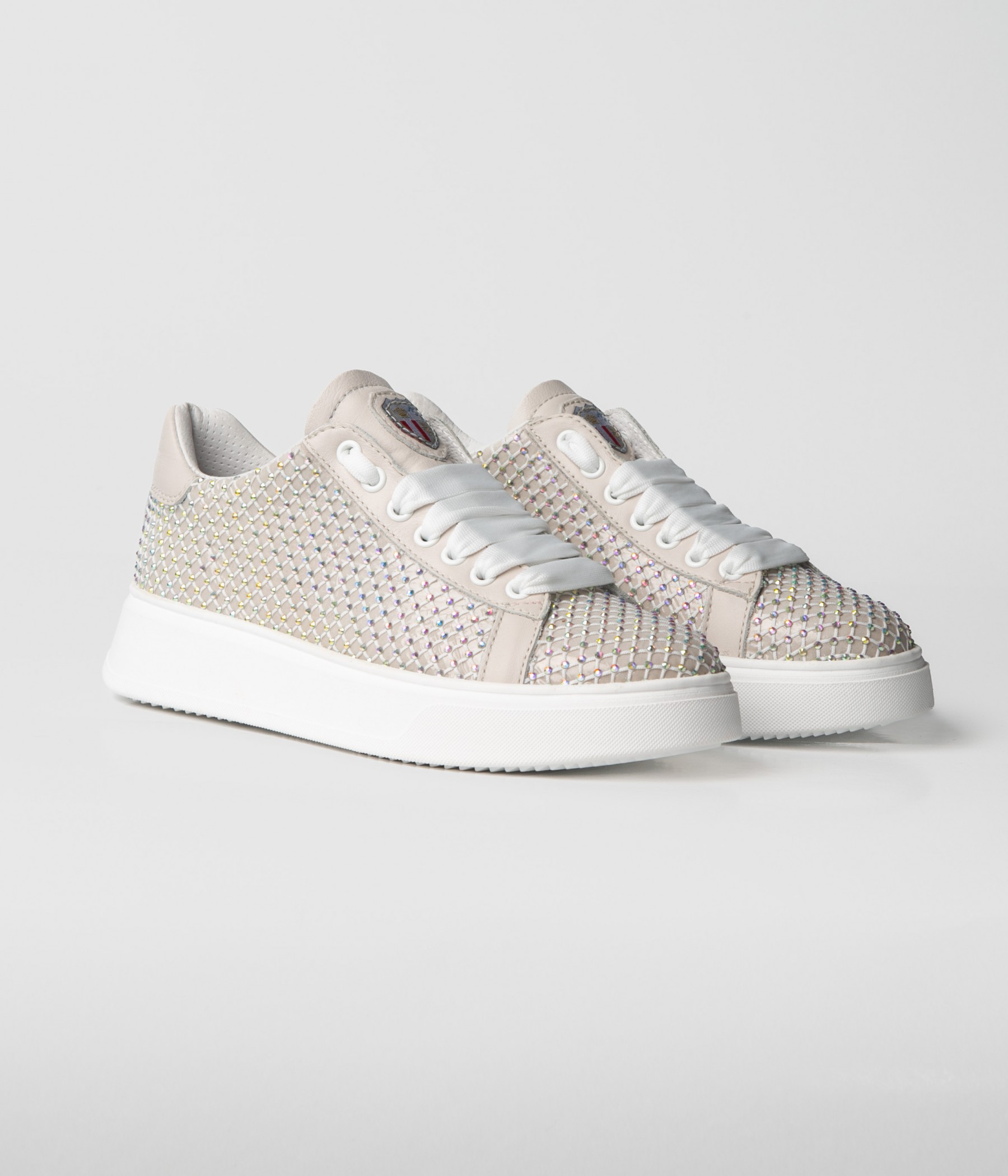 These comfortable casual-chic sneakers combine a white crystal mesh with beige leather inserts.