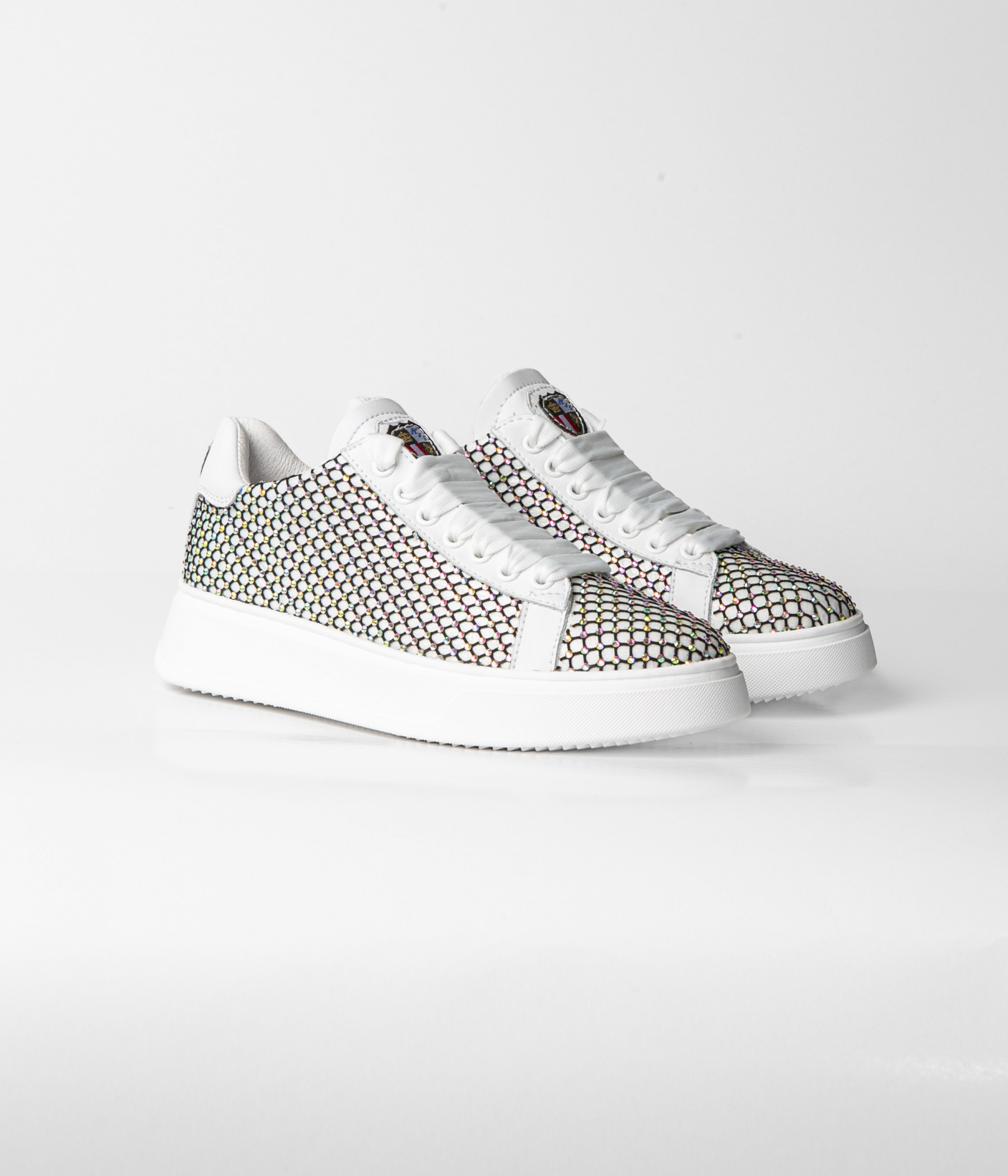 Sneakers with black crystal mesh and white leather accents.