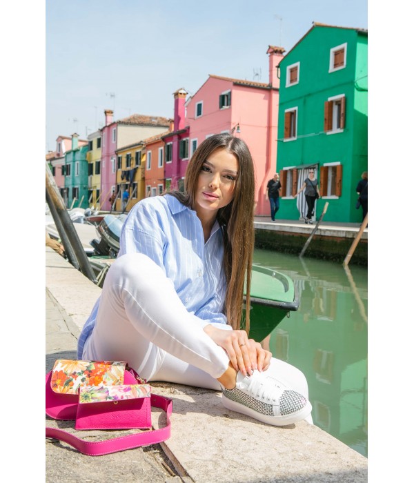 These comfortable casual-chic sneakers combine a black crystal mesh with white leather inserts.
