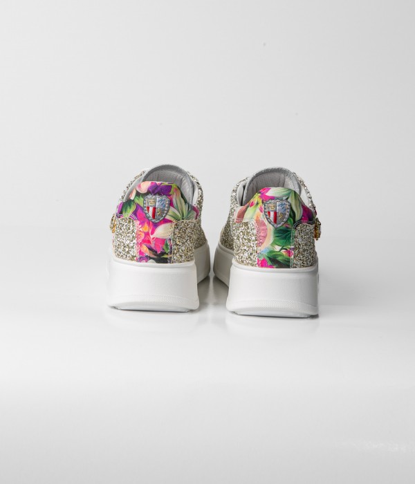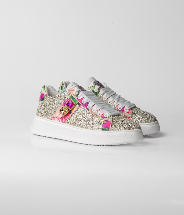 Leather and glitter sneakers with accessory.