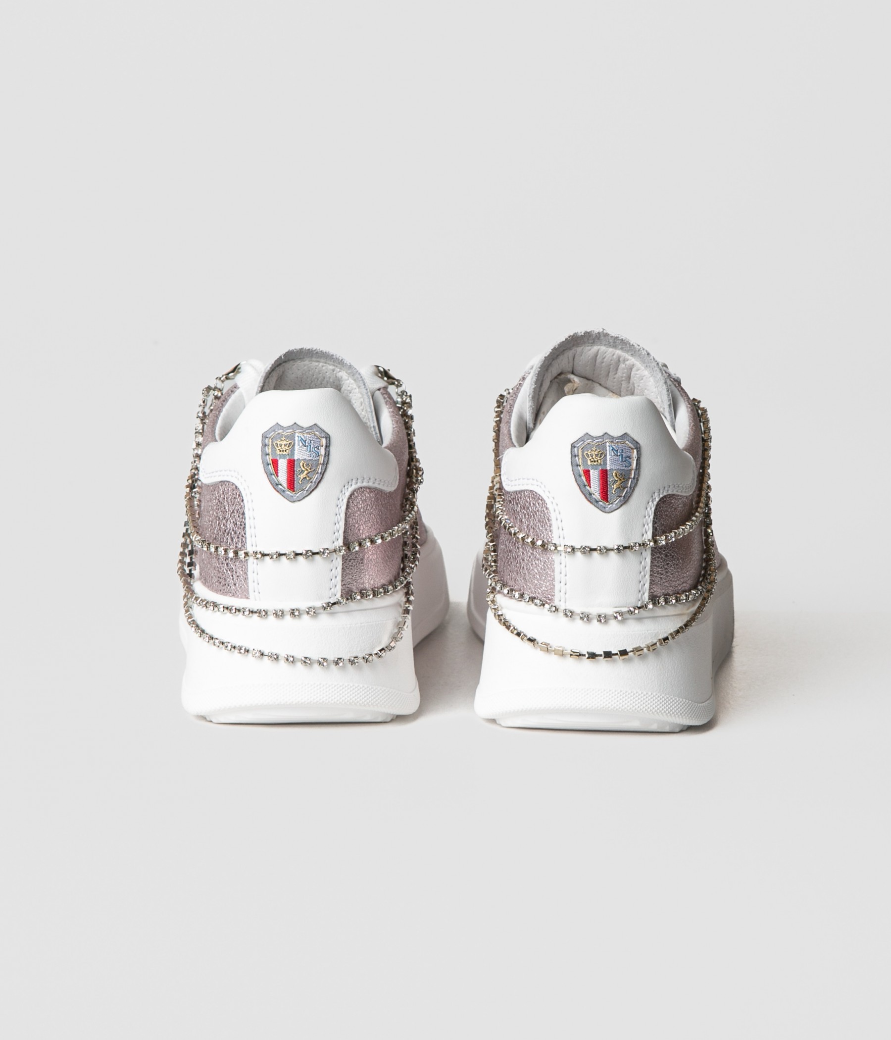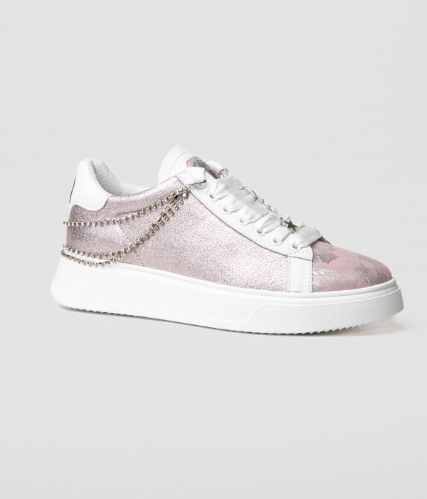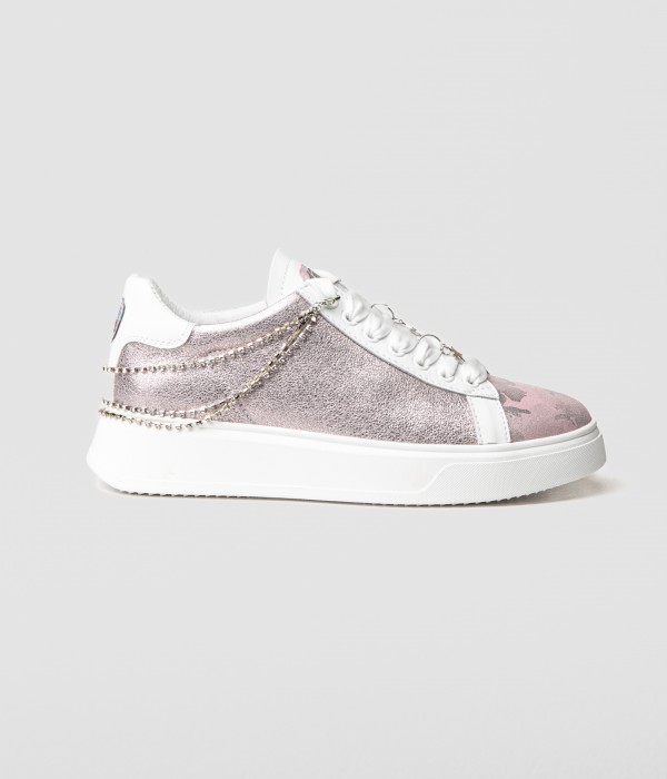 Pink-colored sneaker made of laminated leather. Accessories are removable