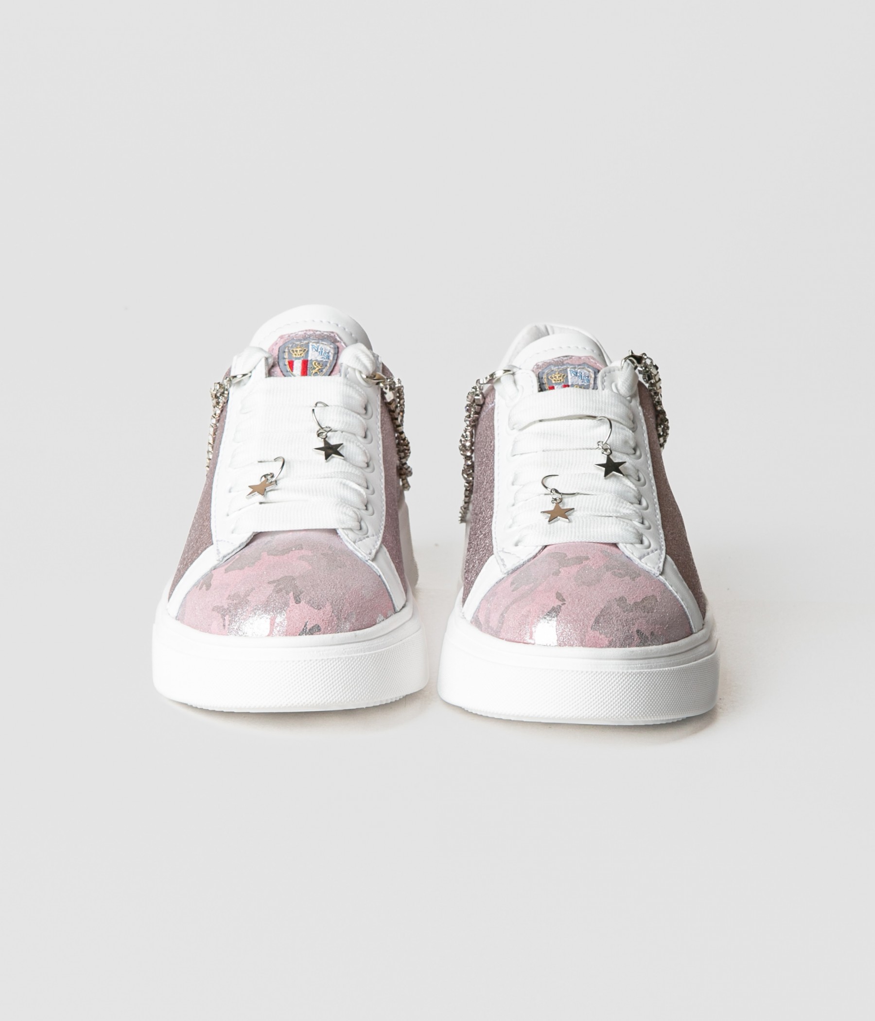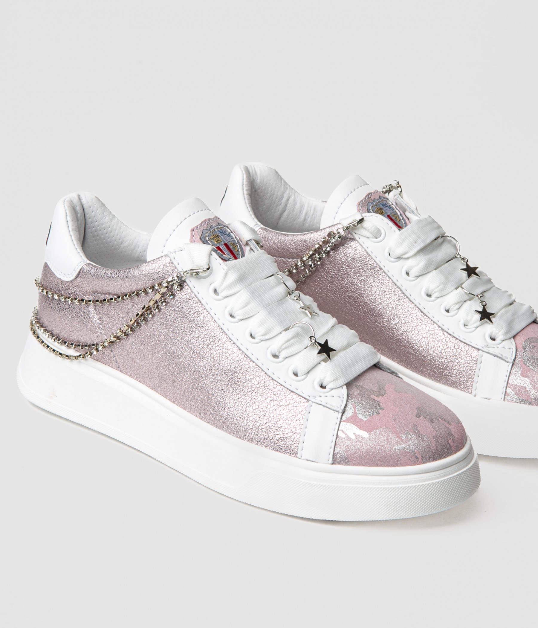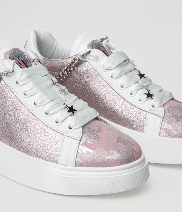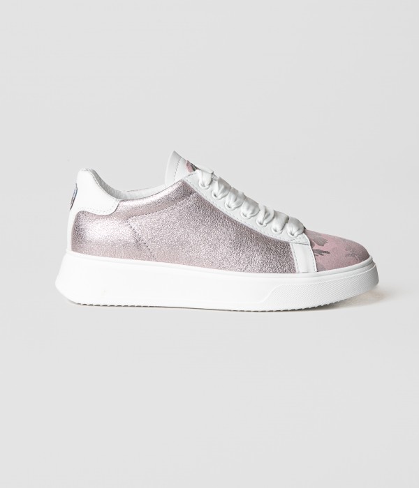 Made-in-Italy sneakers in genuine pink laminated leather. The inserts on the toe are "camouflage" style leather.