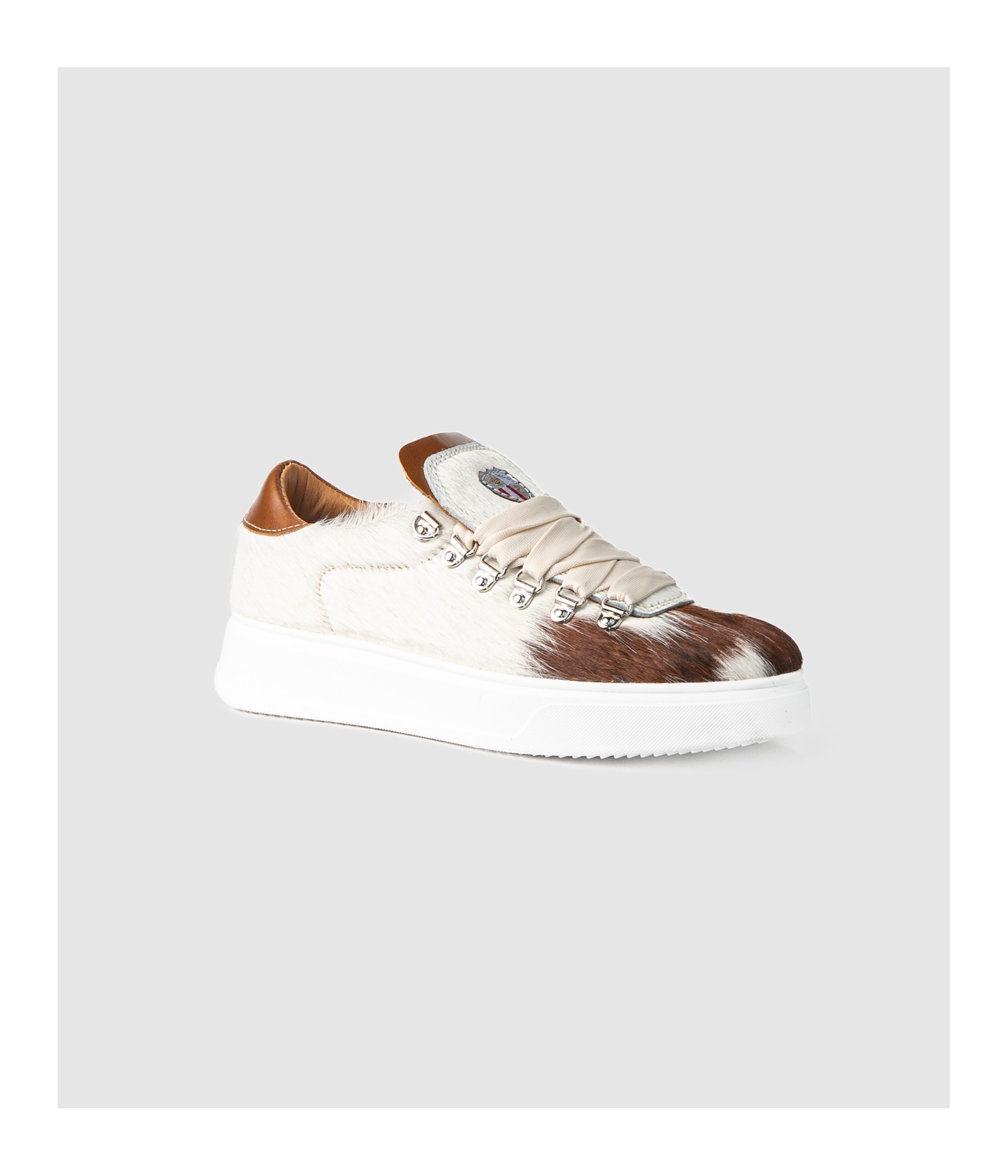 Sneakers with simple lines, in natural calf hair leather colour and pull-up calfskin details.