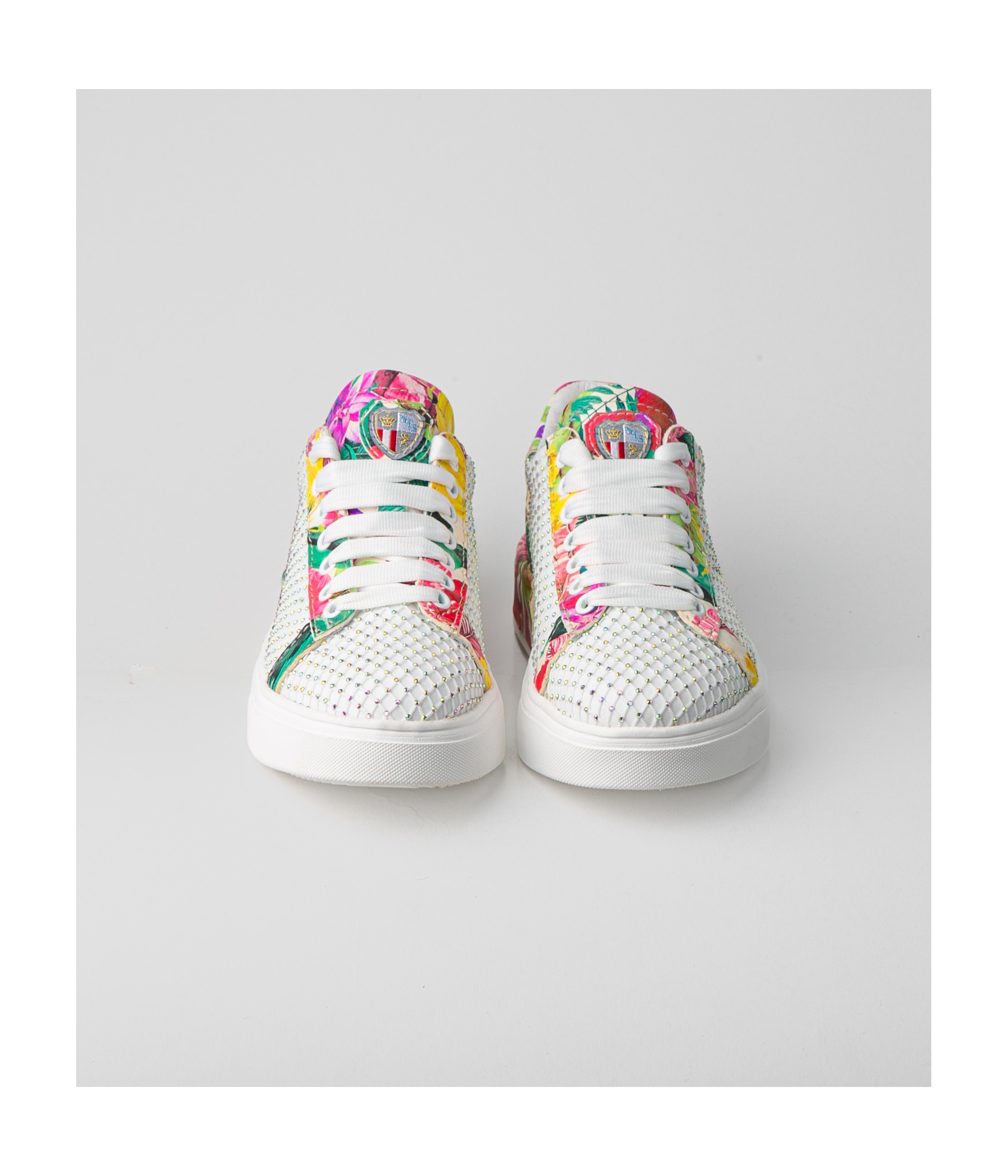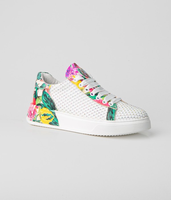 These sneakers combine the elegance of white crystal mesh with the intensity of colors from the floral-patterned printed leather.