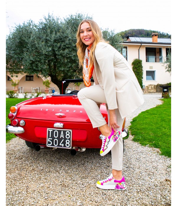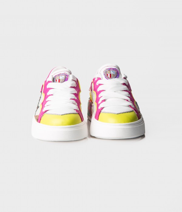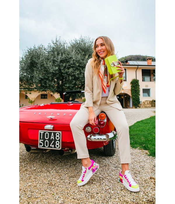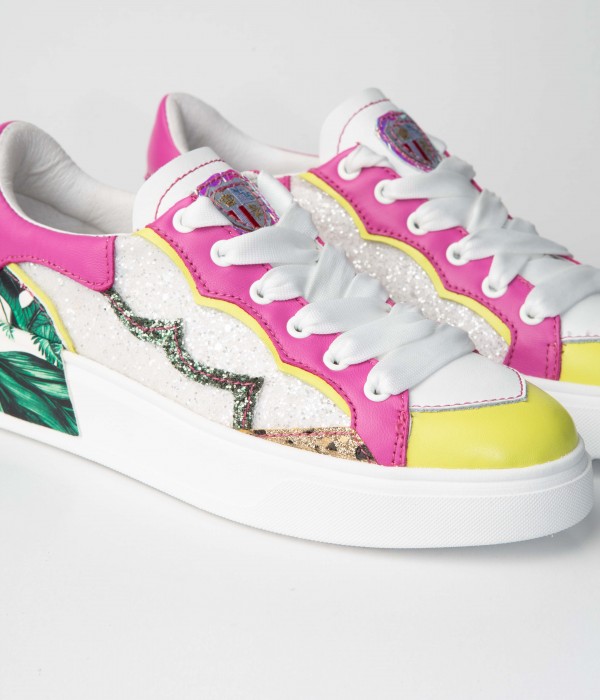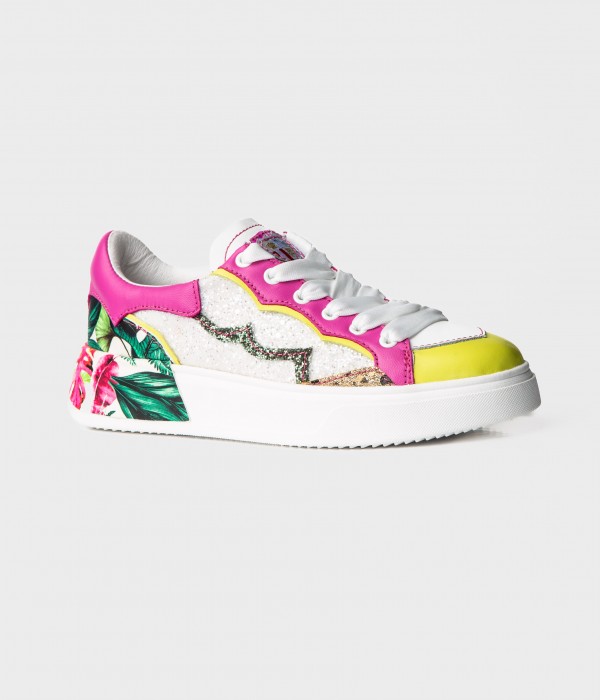 White glitter sneakers with fuchsia, lime and floral pattern leather inserts.