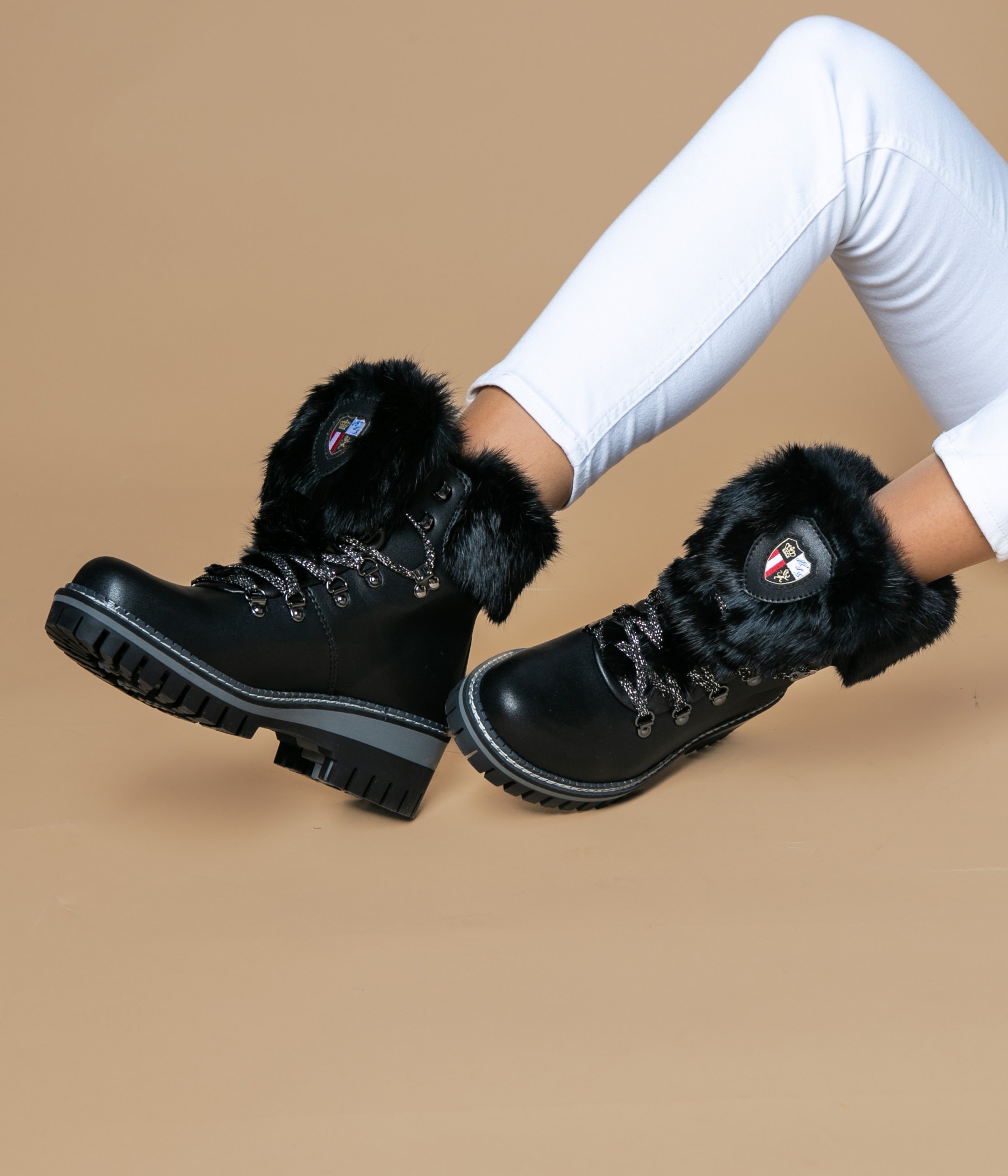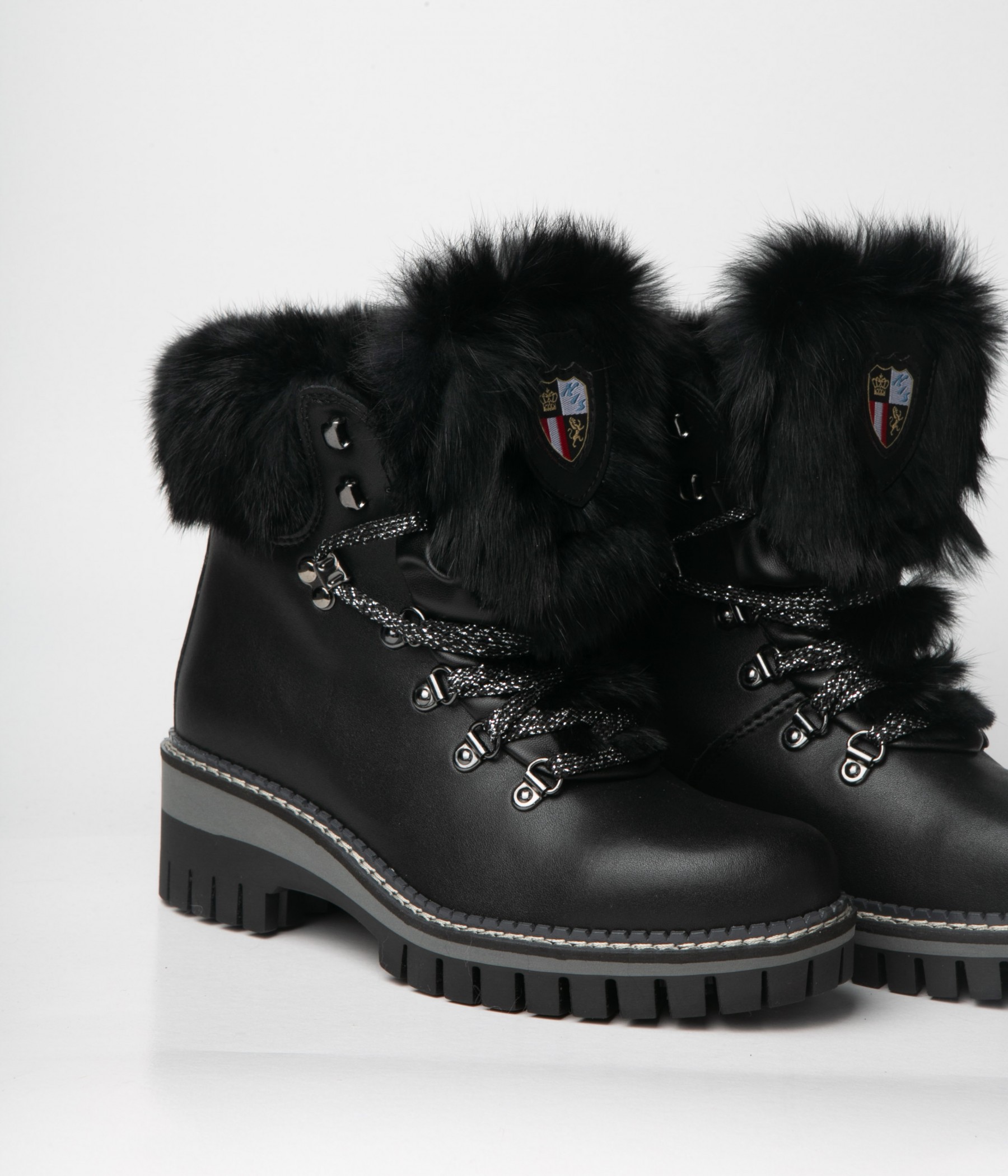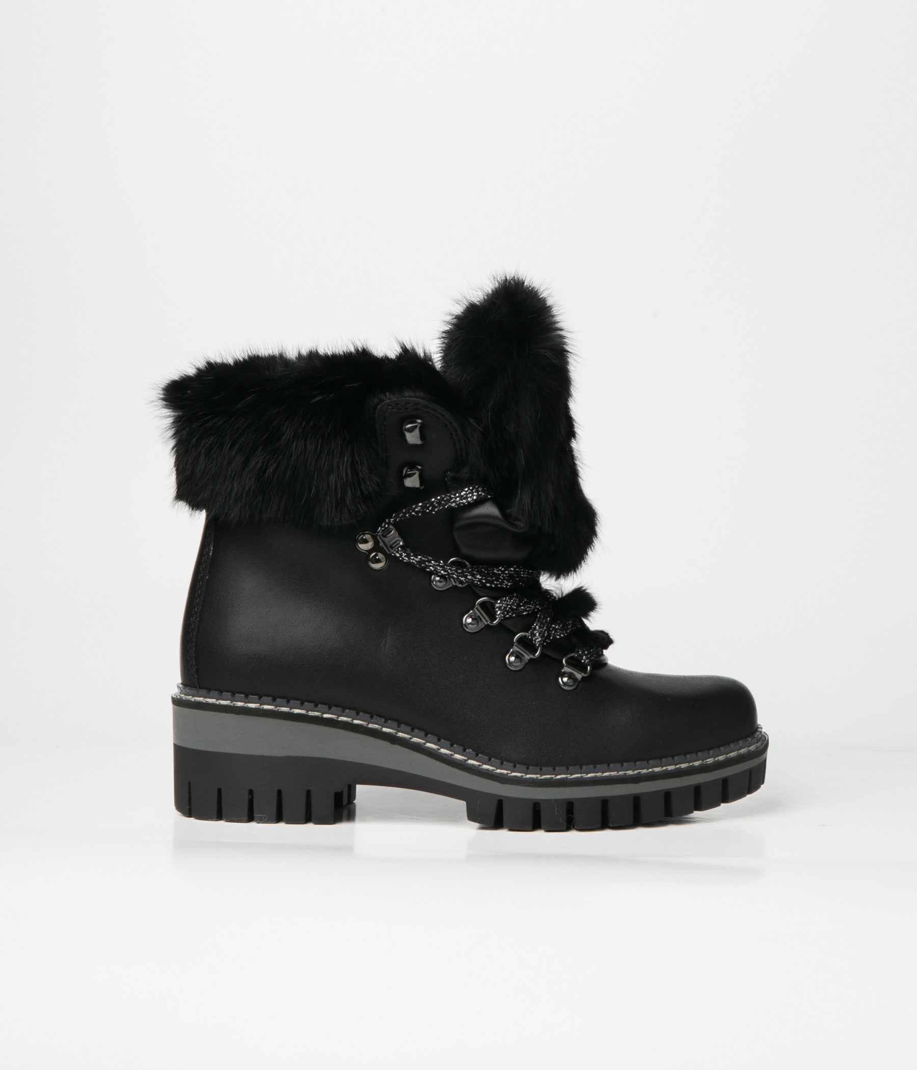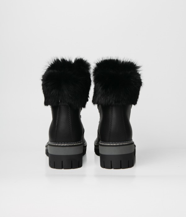 Lace-up ankle boot in black smooth calfskin and black rabbit fur collar.
