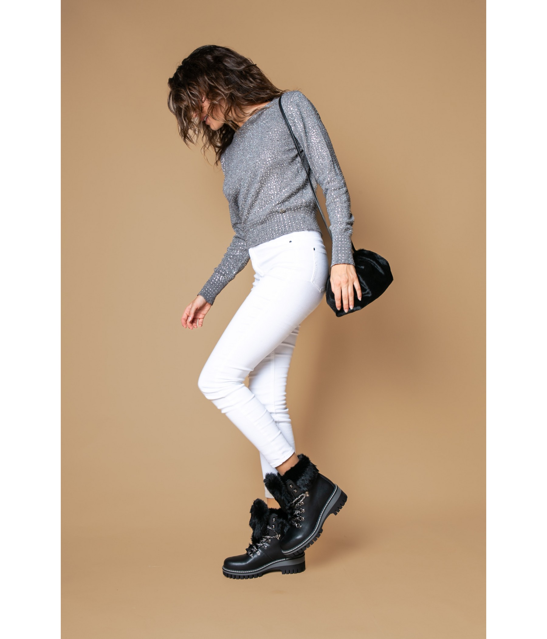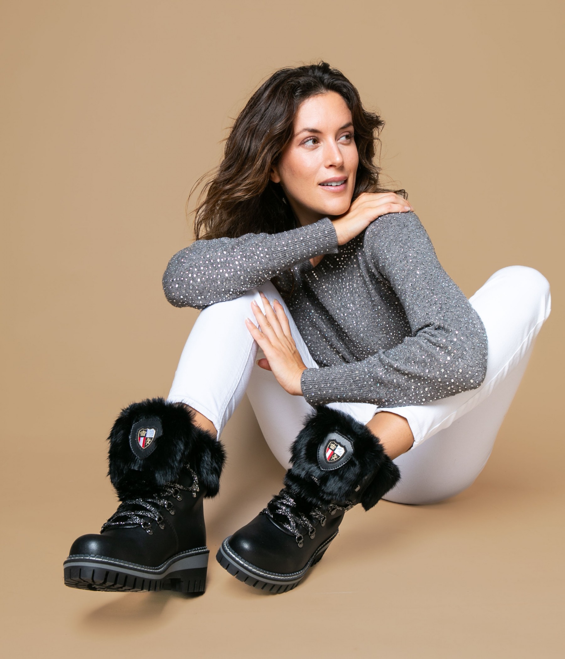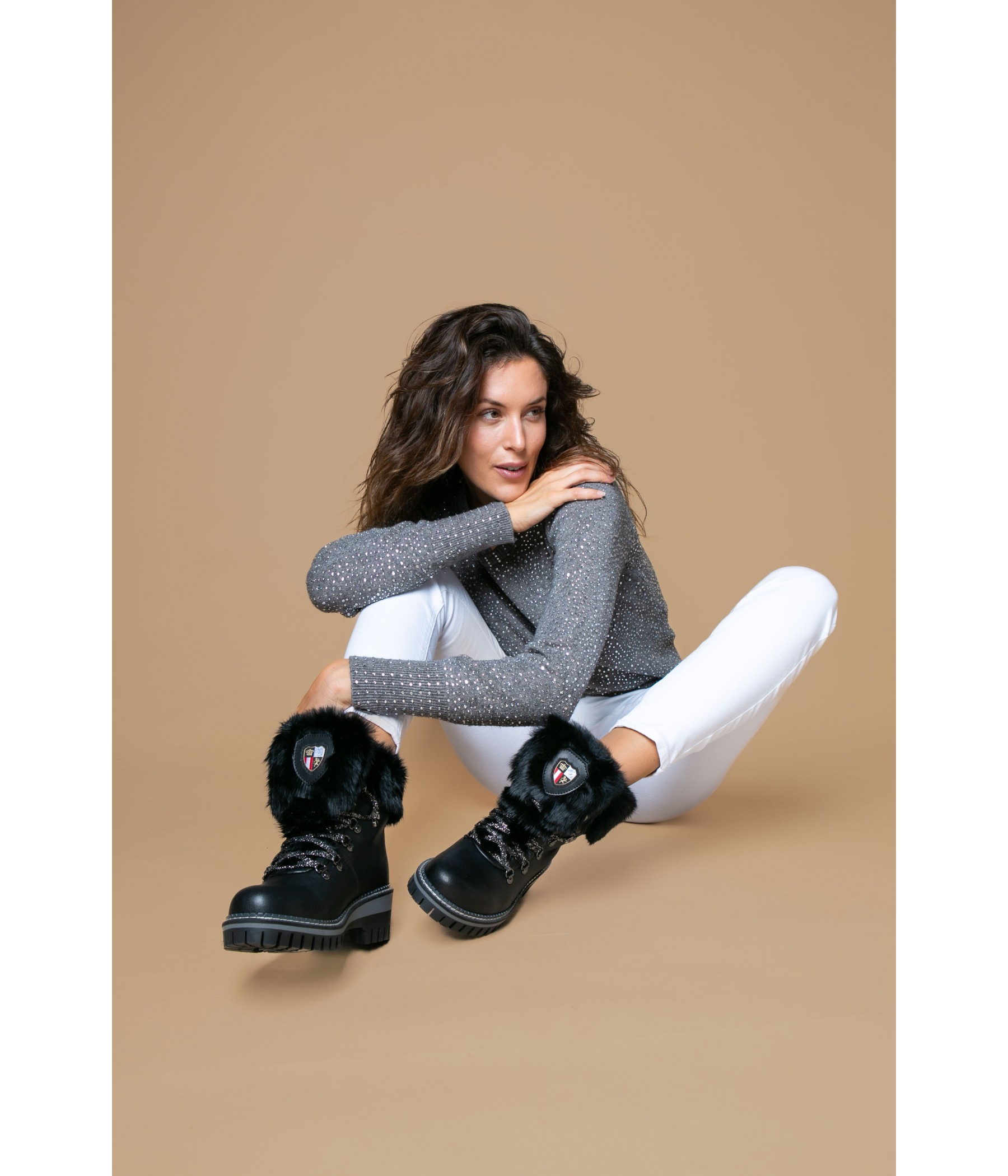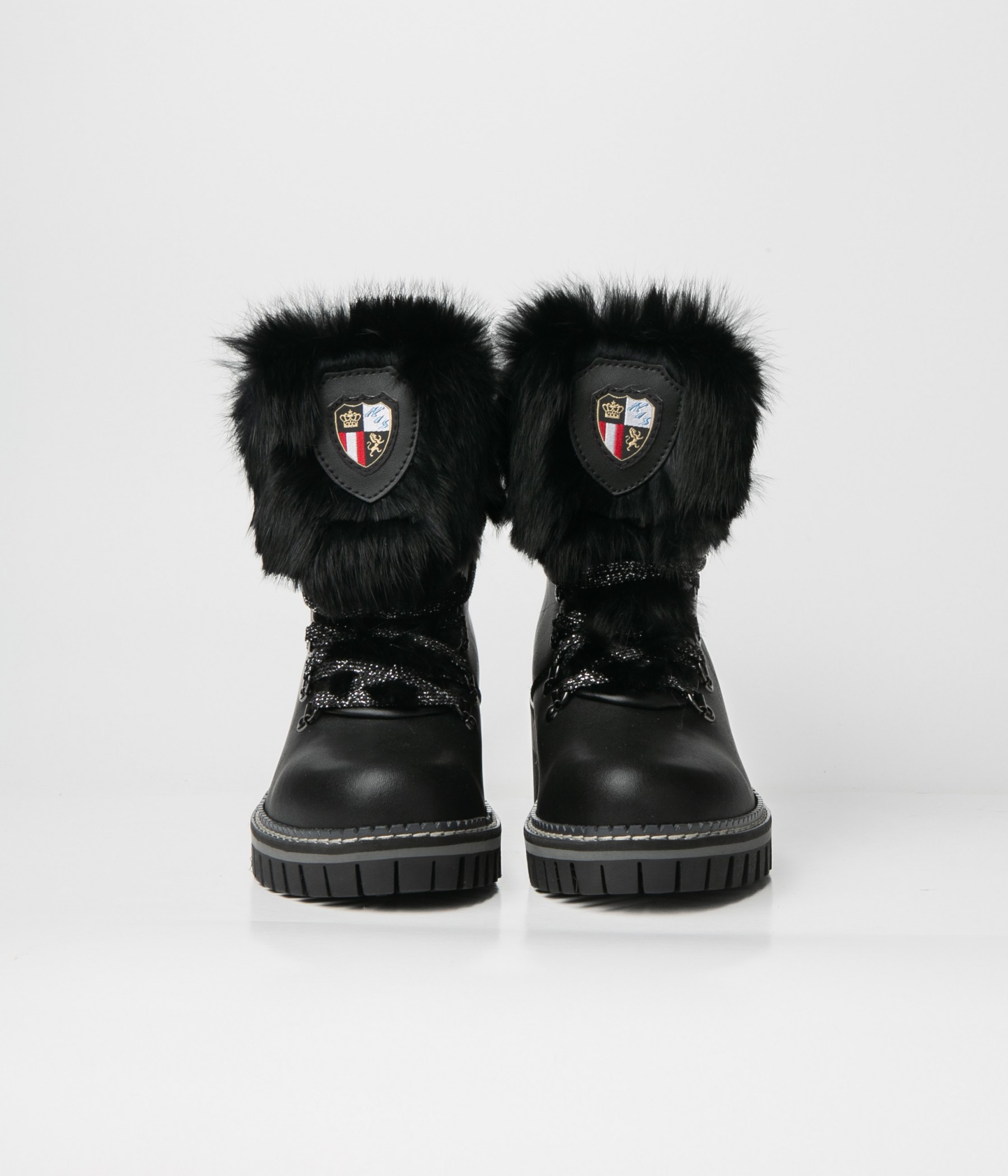 Lace-up ankle boot in black smooth calfskin and black rabbit fur collar.