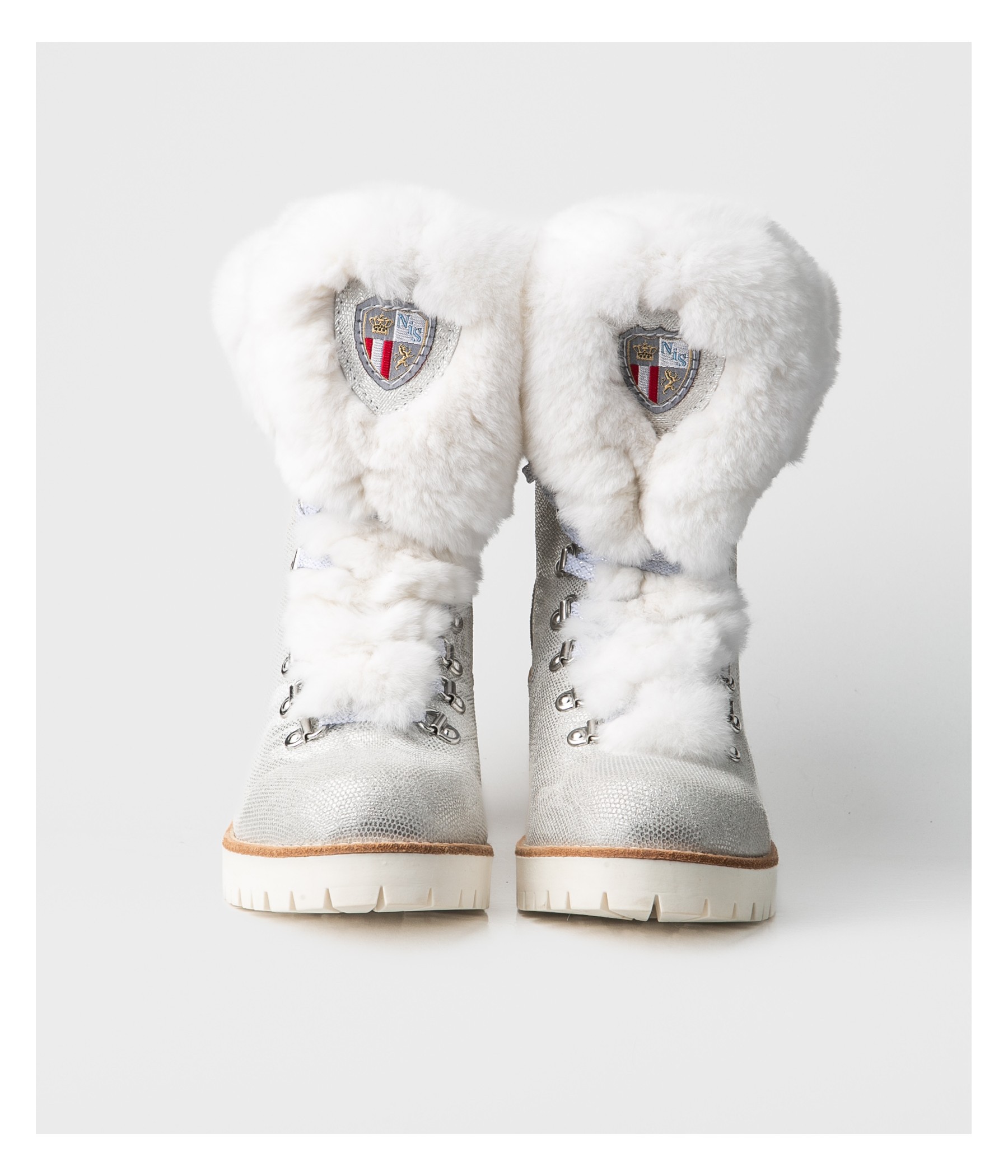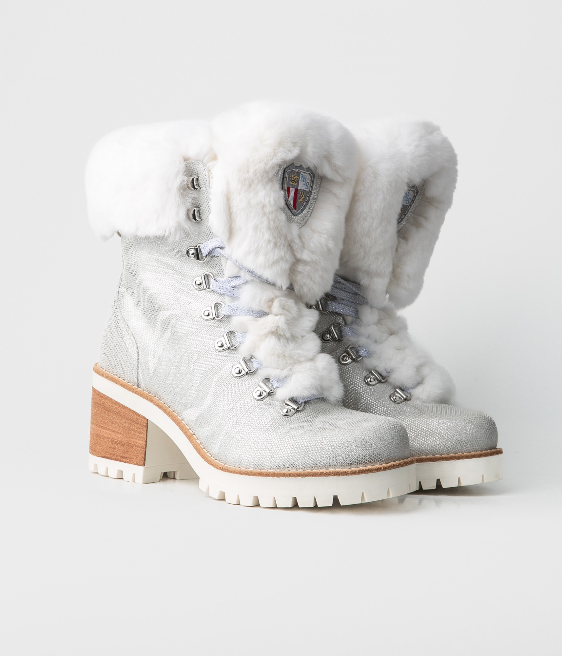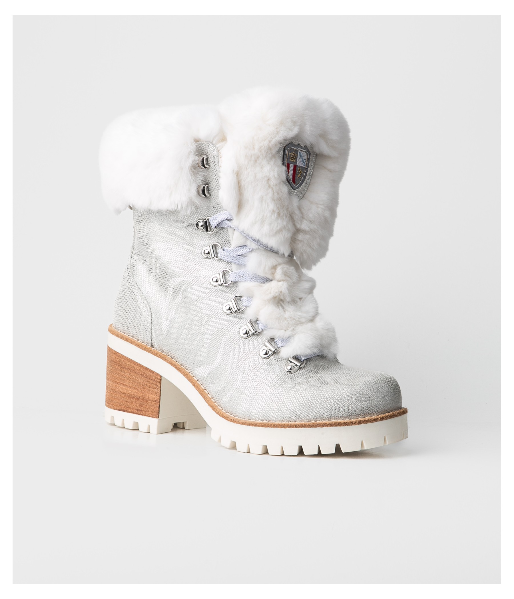 This lace-up ankle boot is crafted from silver laminated embossed leather with a bold animal print.