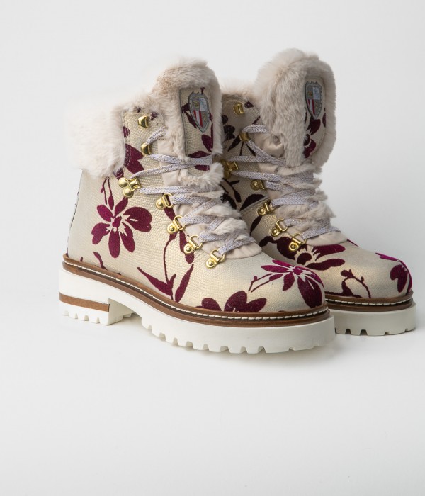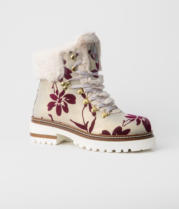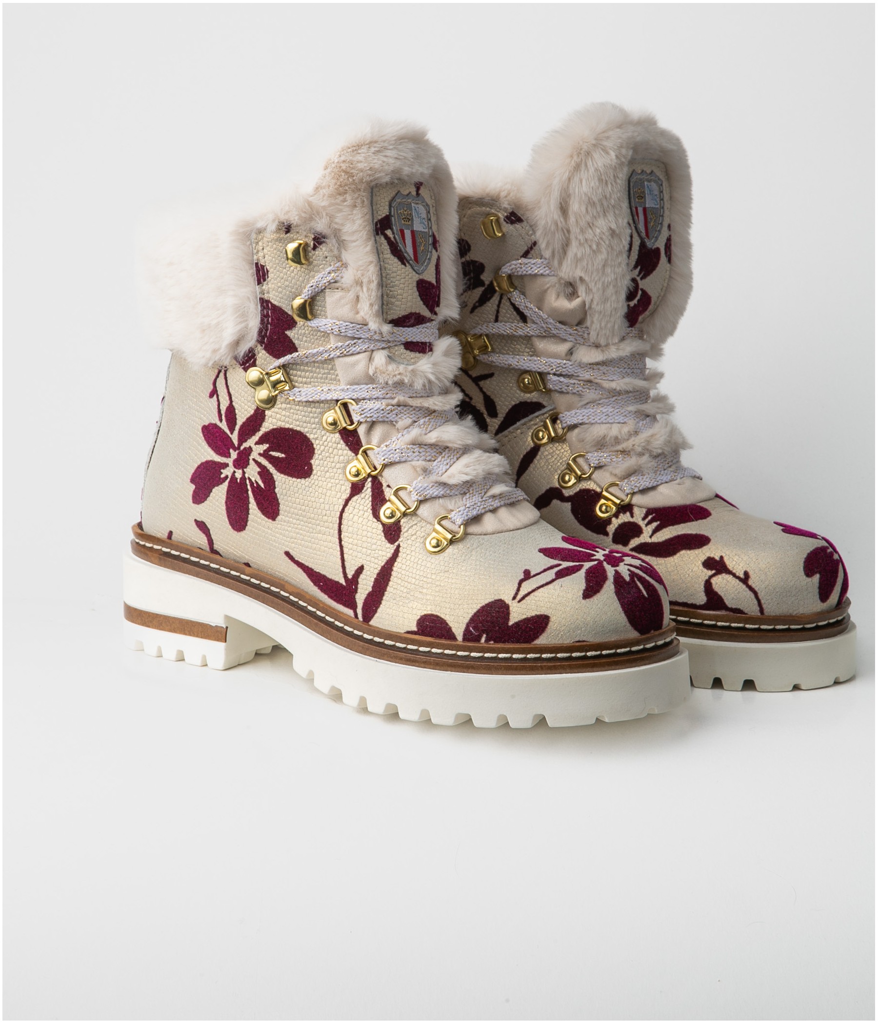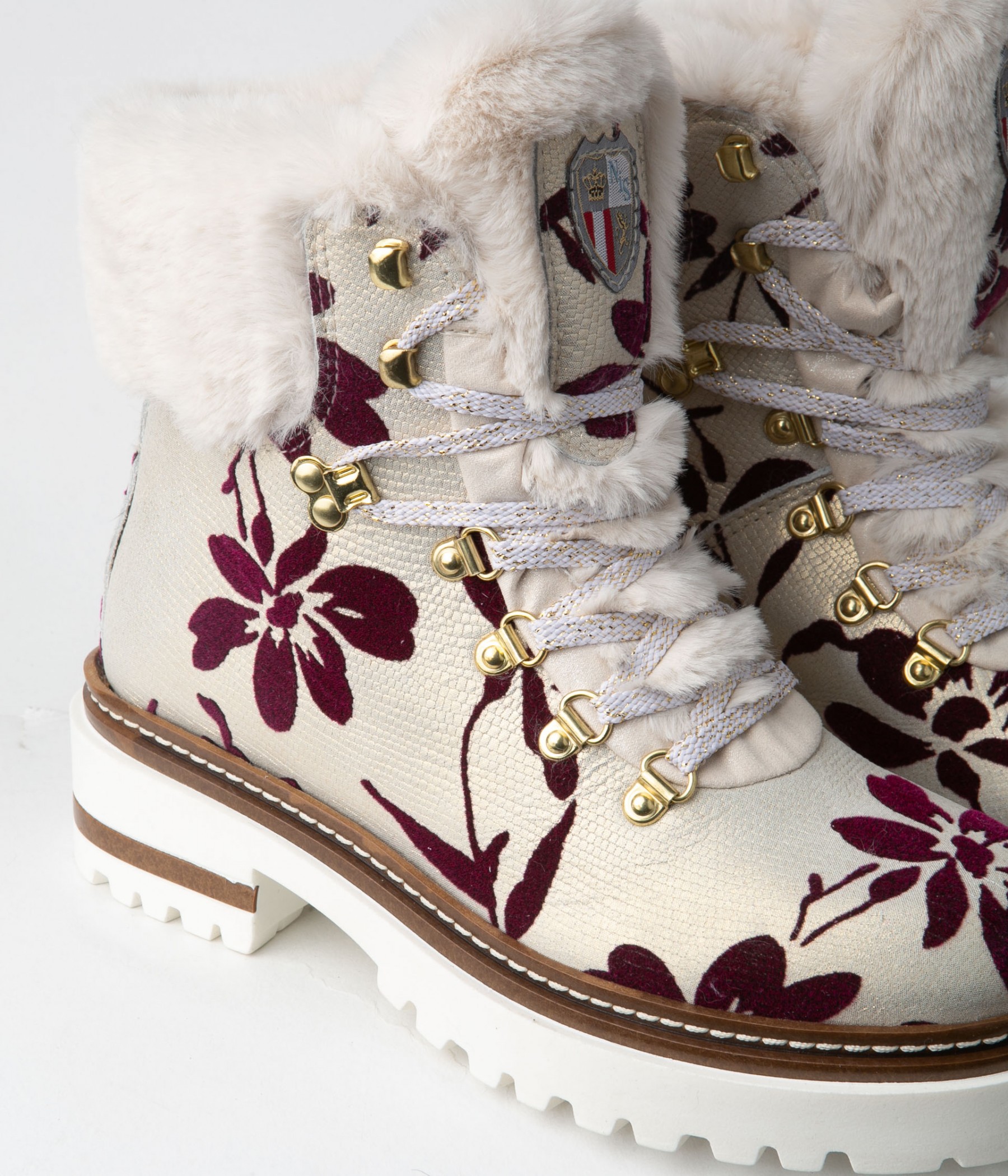 Ankle boot crafted from leather with a sophisticated gold reptile-effect print, embellished with a flocked burgundy floral pattern.