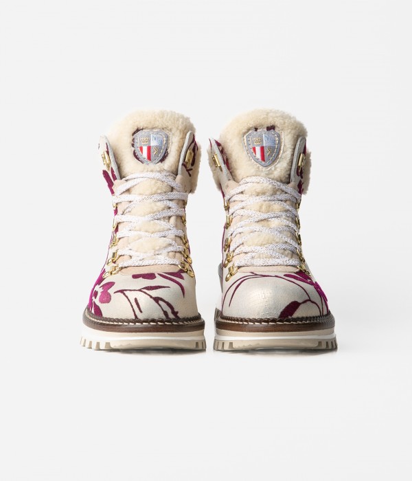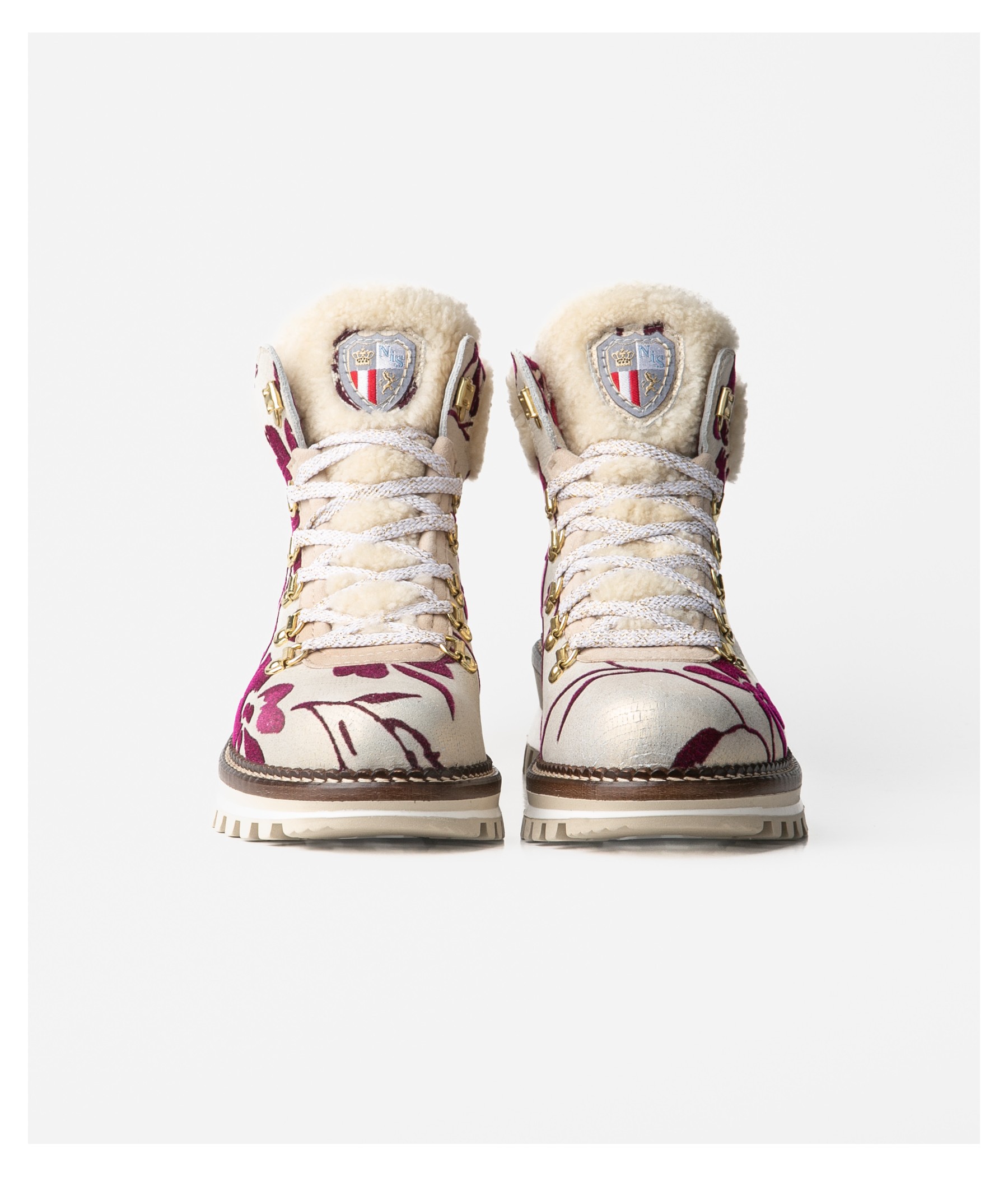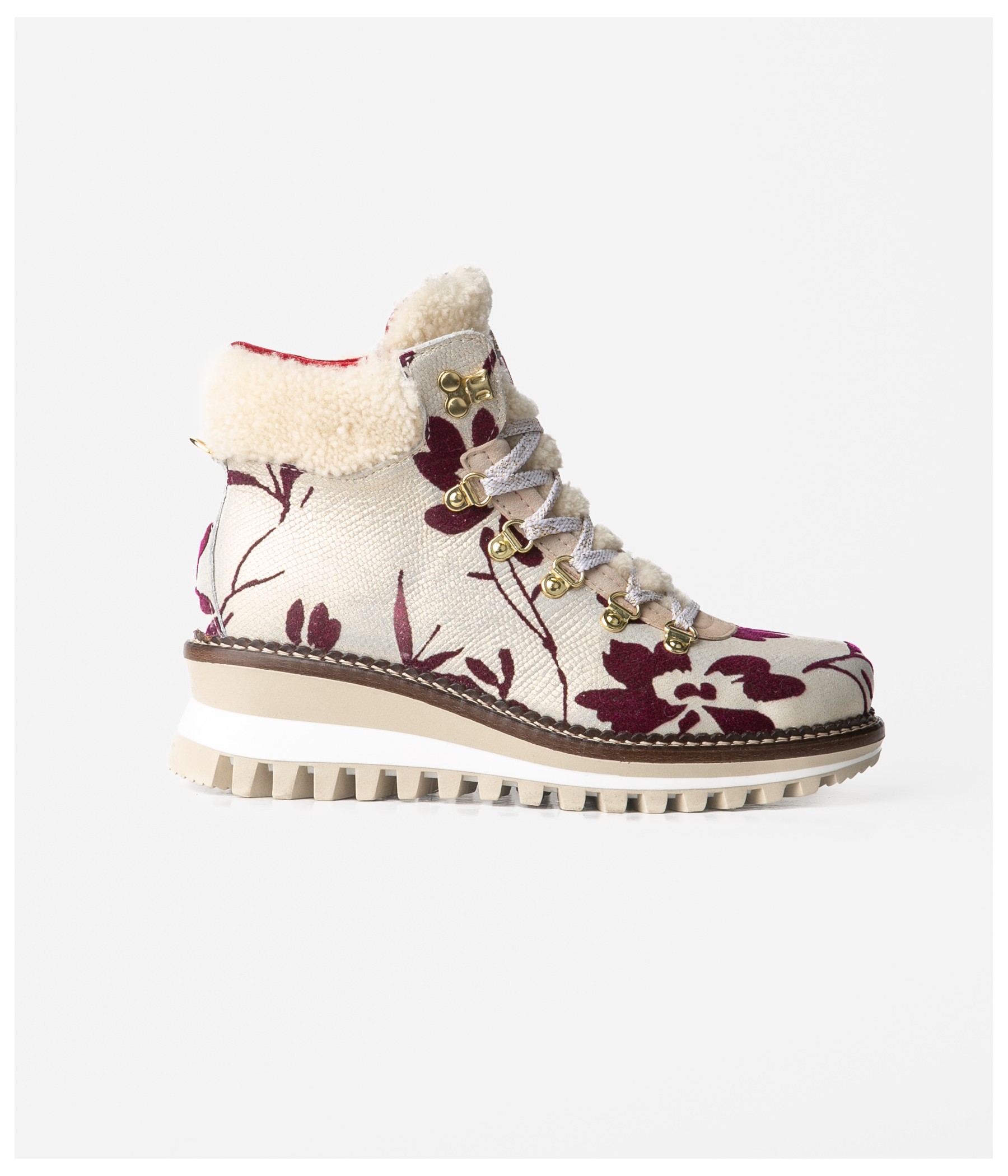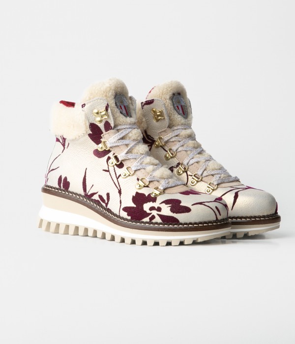 Gold and burgundy flocked leather ankle boot with sheepskin details.