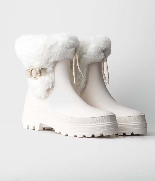 This boot is crafted from white rubber and is embellished with faux-fur details.