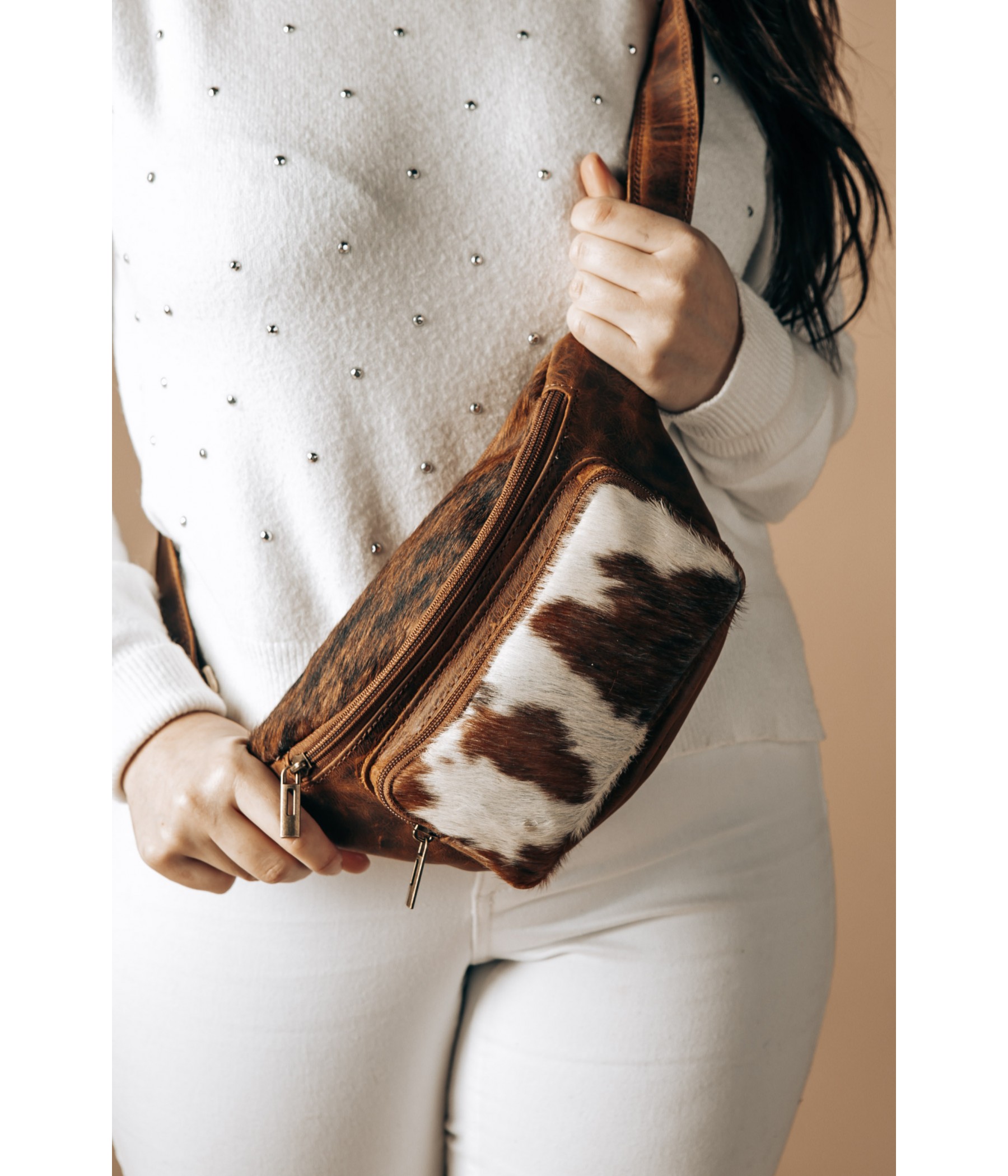 Questo marsupio unisce funzionalità e stile unico. Realizzato in pelle di alta qualità con una finitura rustica, presenta un audace inserto in cavallino (pelle bovina con pelo) sul taschino frontale, che lo rende un accessorio dal carattere distintivo.