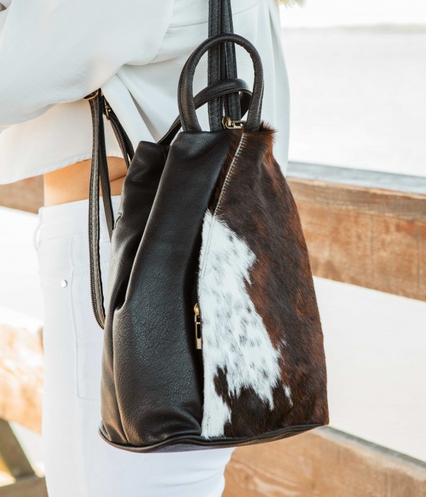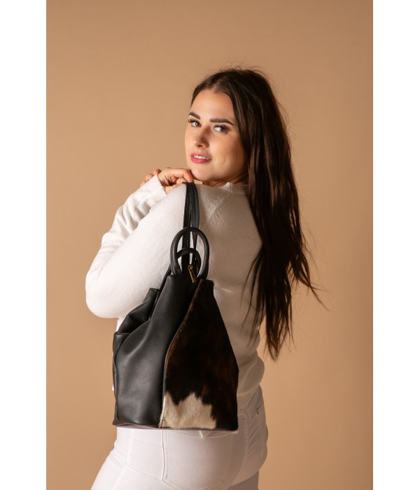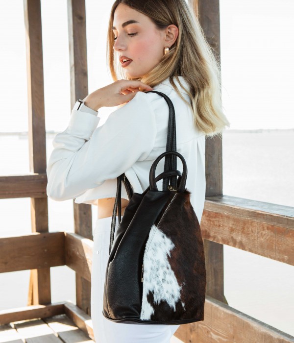 Un accessorio elegante e versatile, perfetto per chi cerca stile e funzionalità. Questo zaino ibrido unisce la morbidezza della pelle nera alla texture audace della pelle "cavallino" (pelle bovina con pelo), creando un look moderno e distintivo.