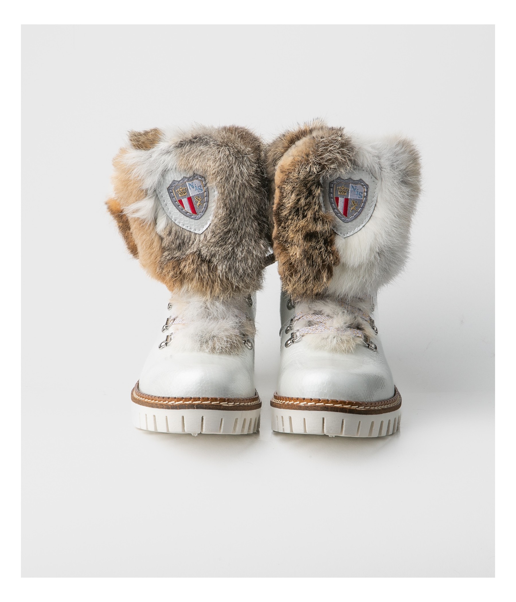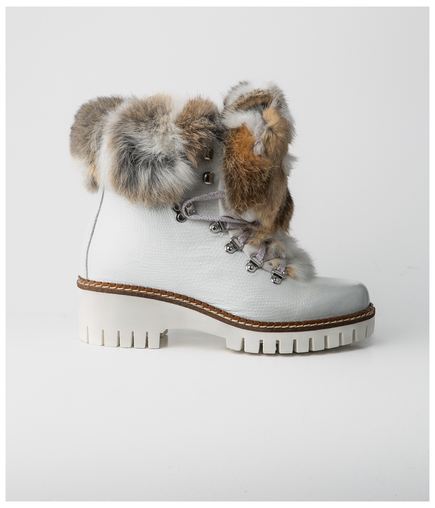 Stivaletto stringato in pelle di vitello bianca verniciata e stampata rettile. Collarino in pelliccia di lapin sfumato beige e bianco.