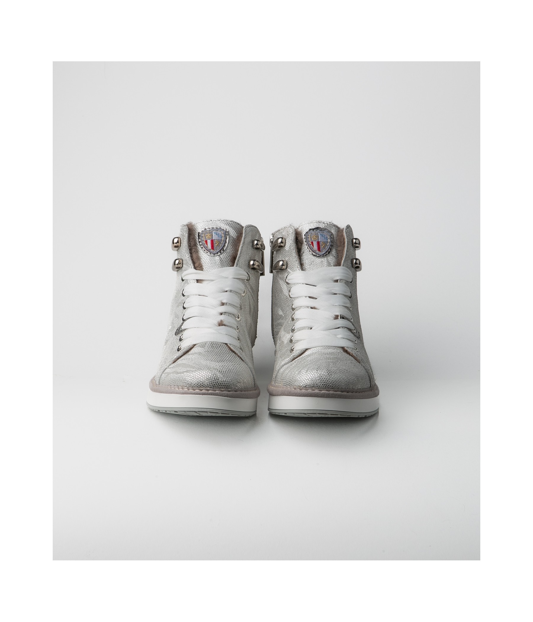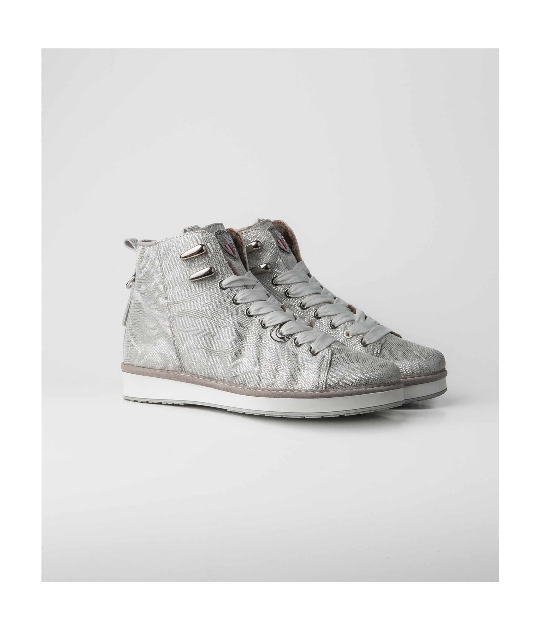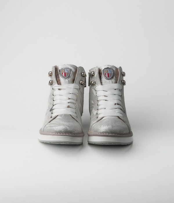 High-top sneaker in pelle laminata argento e fodera in montone.