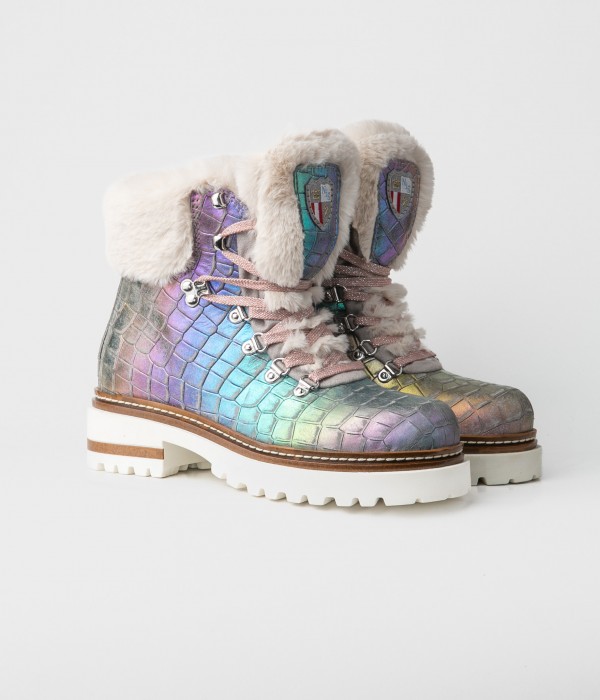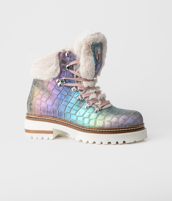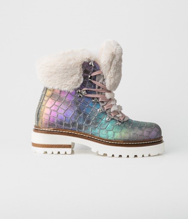 Stivaletto in pelle stampata cocco effetto spazzolato. Dettagli in eco-pelliccia