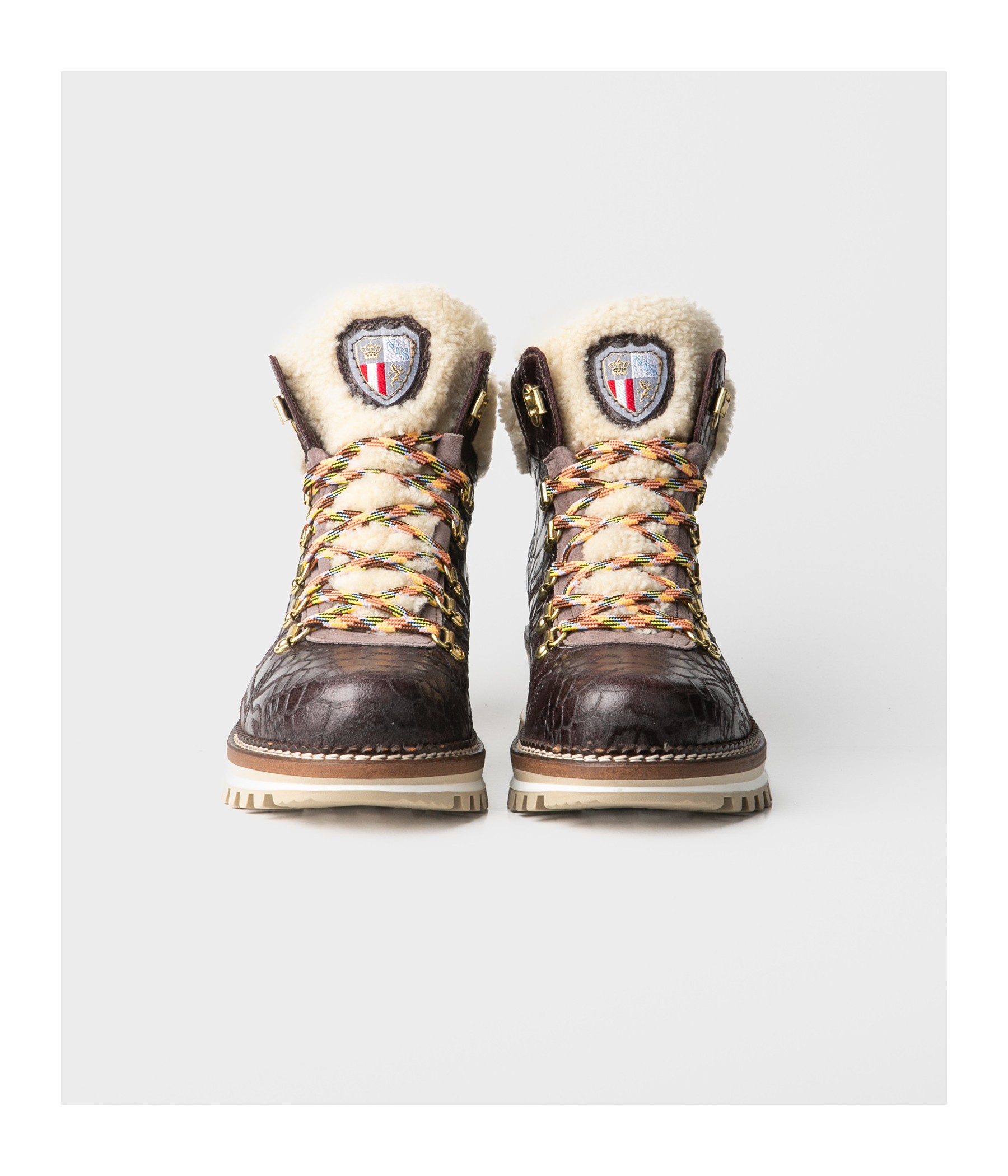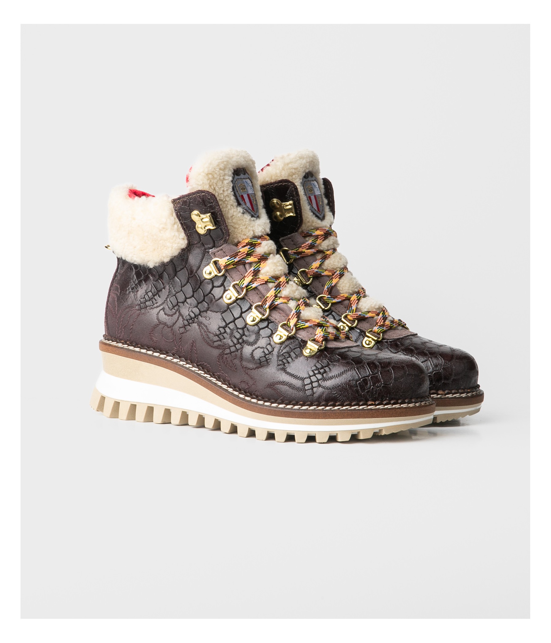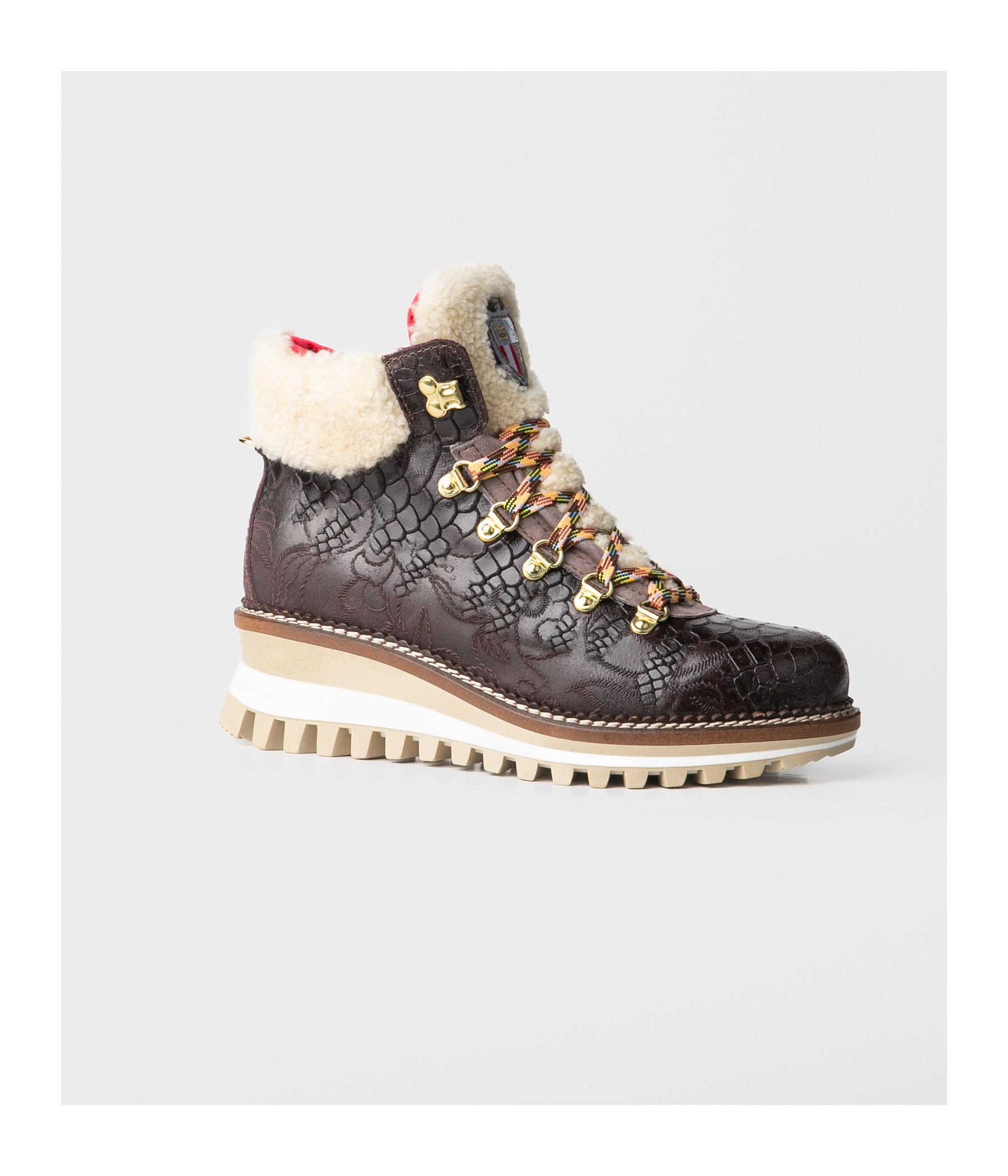 Stivaletto in pelle goffrata effetto vintage con collarino e pattella in montone