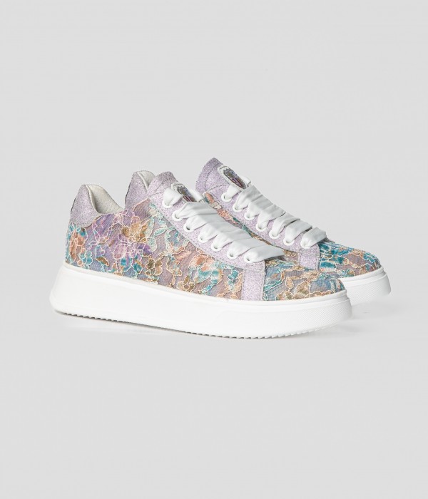 Sneaker in delicato pizzo a motivo floreale, con sfumature lilla che conferiscono un tocco di romantico.