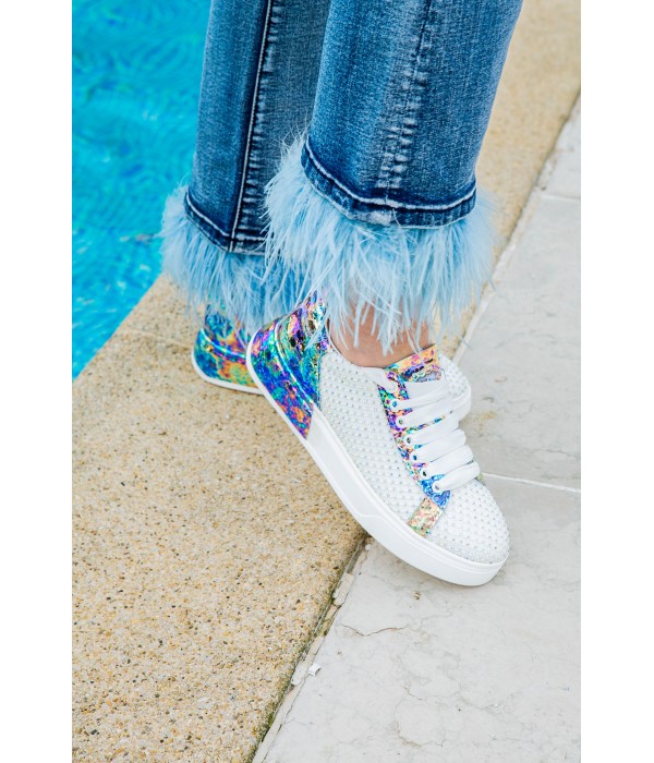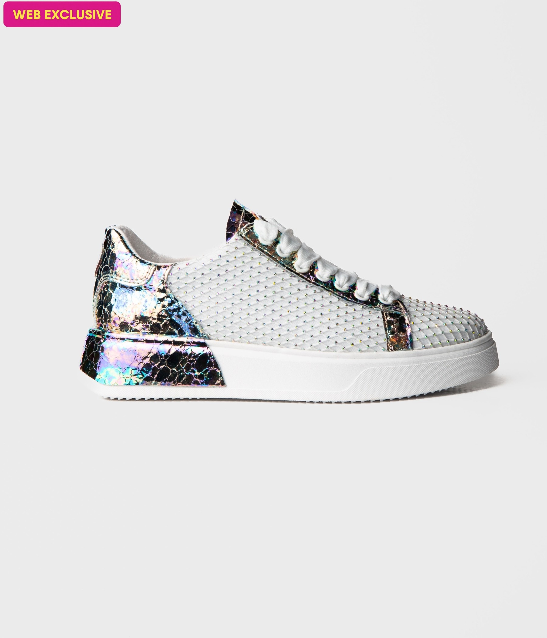 Queste sneaker combinano l'eleganza del crystal mesh bianco condettagli in pelle laminata dall'effetto cangiante,