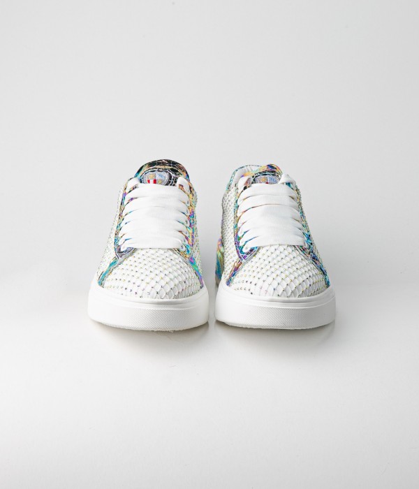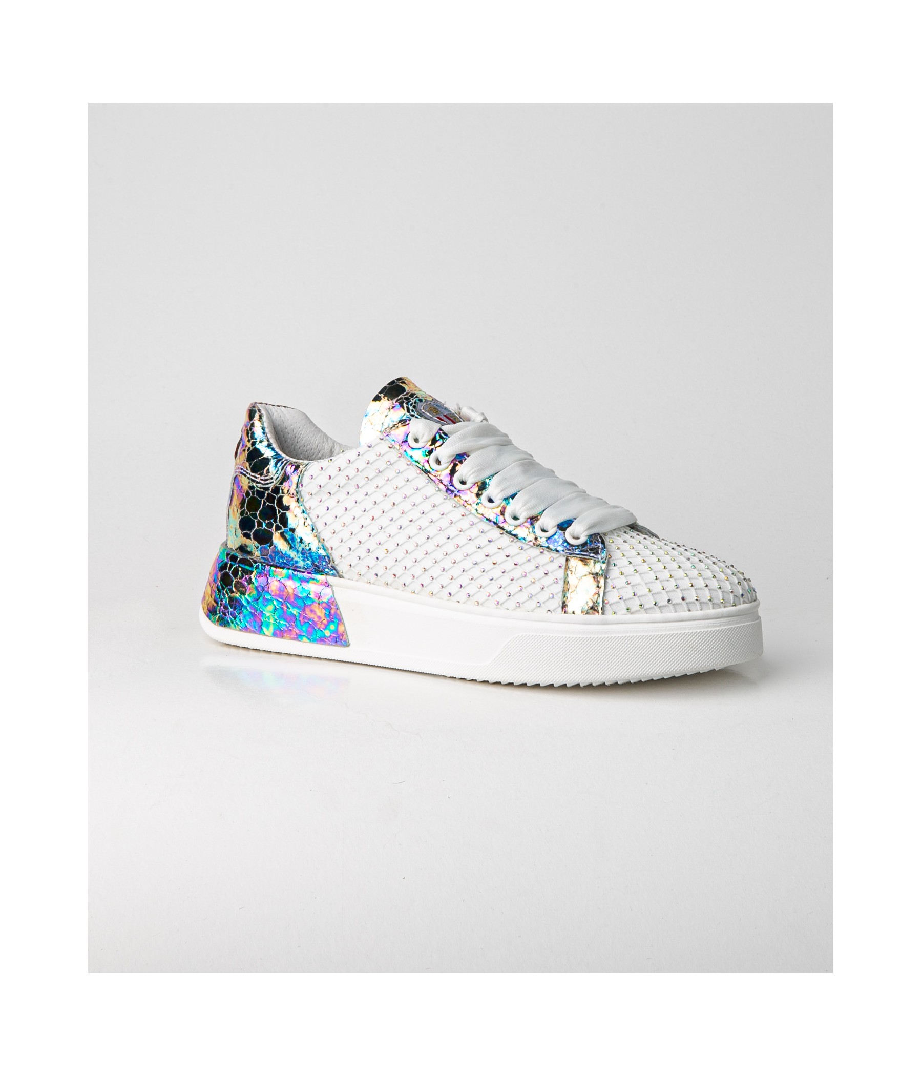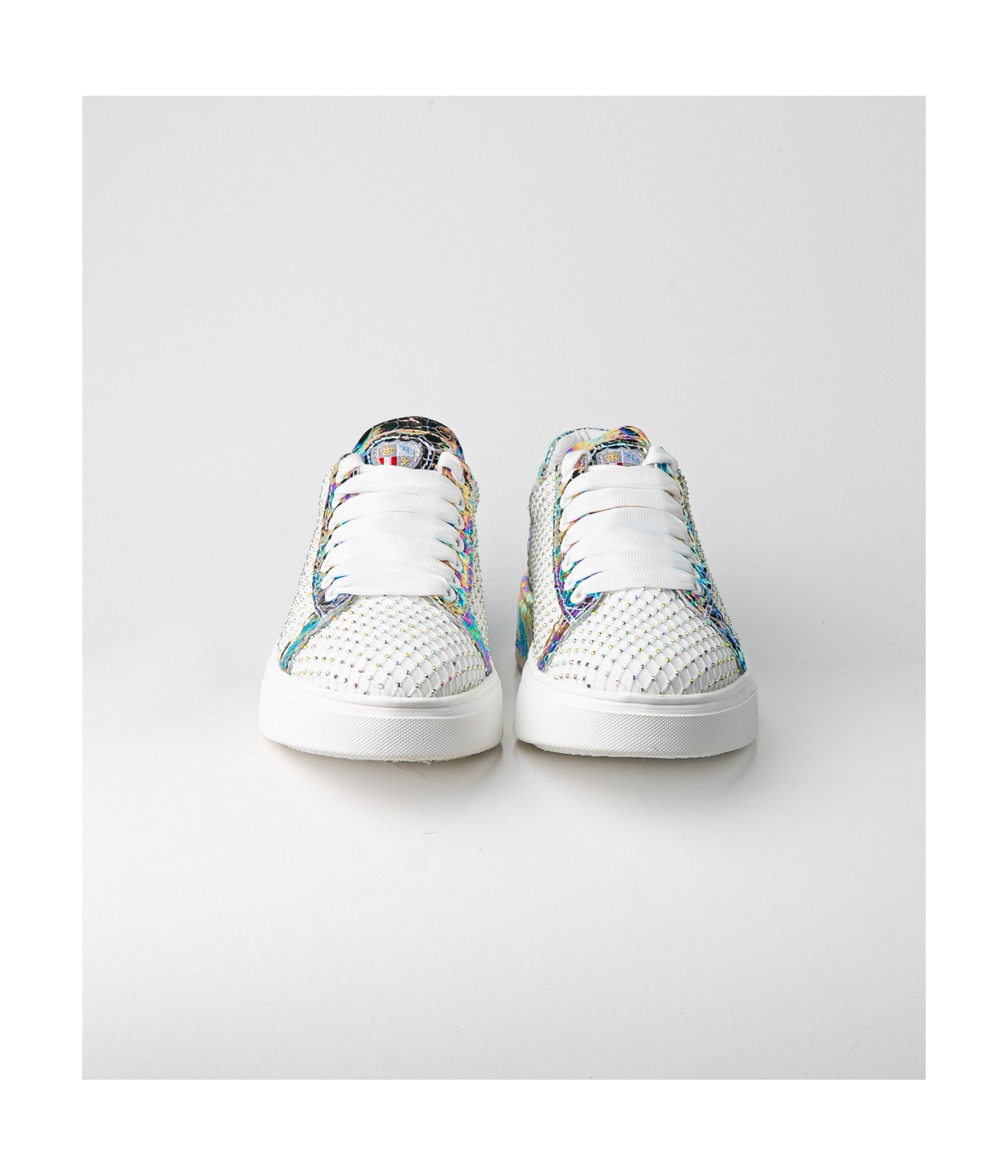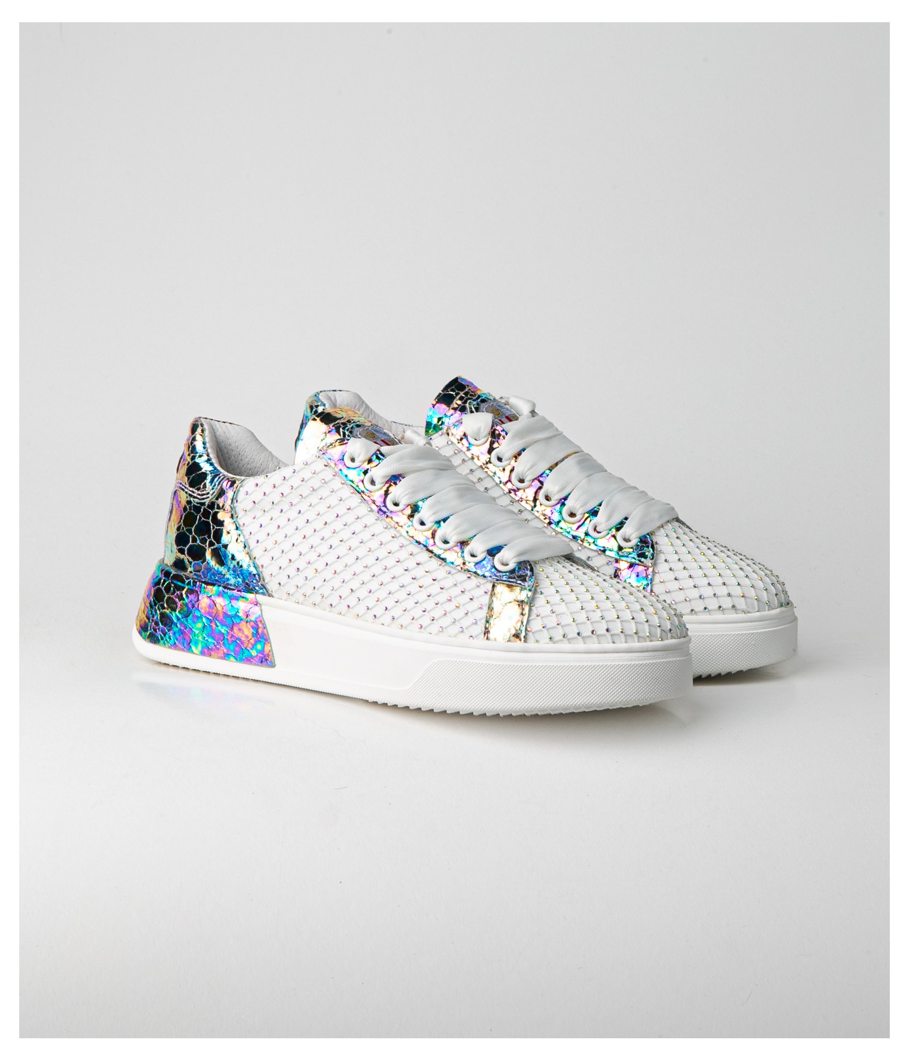 Sneaker in crystal mesh bianca con dettagli in pelle laminata argento multicolor.