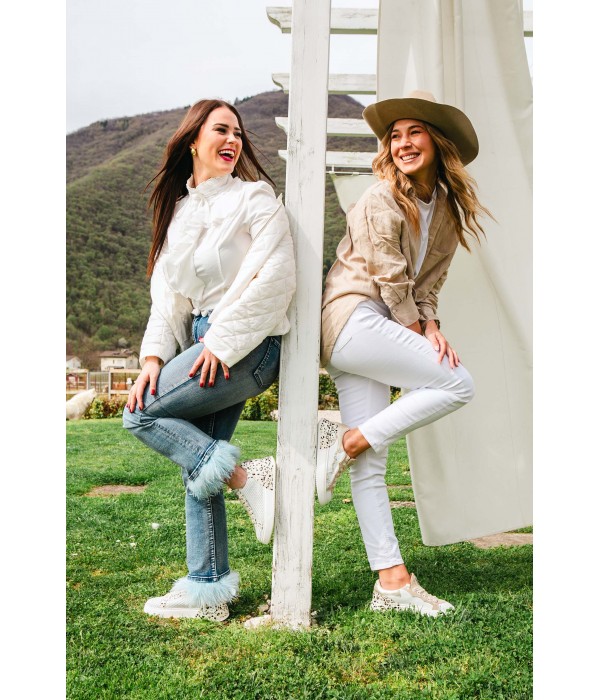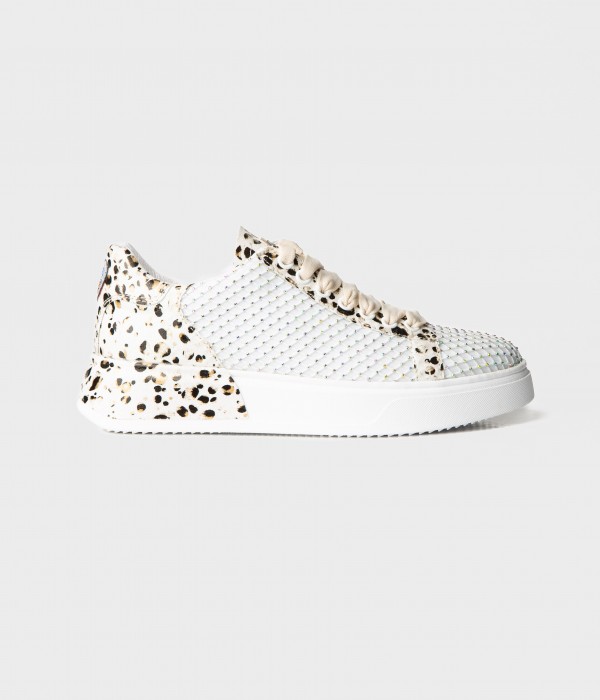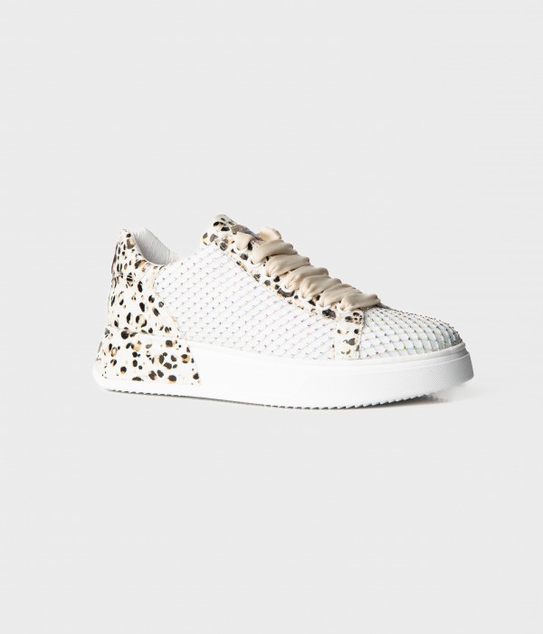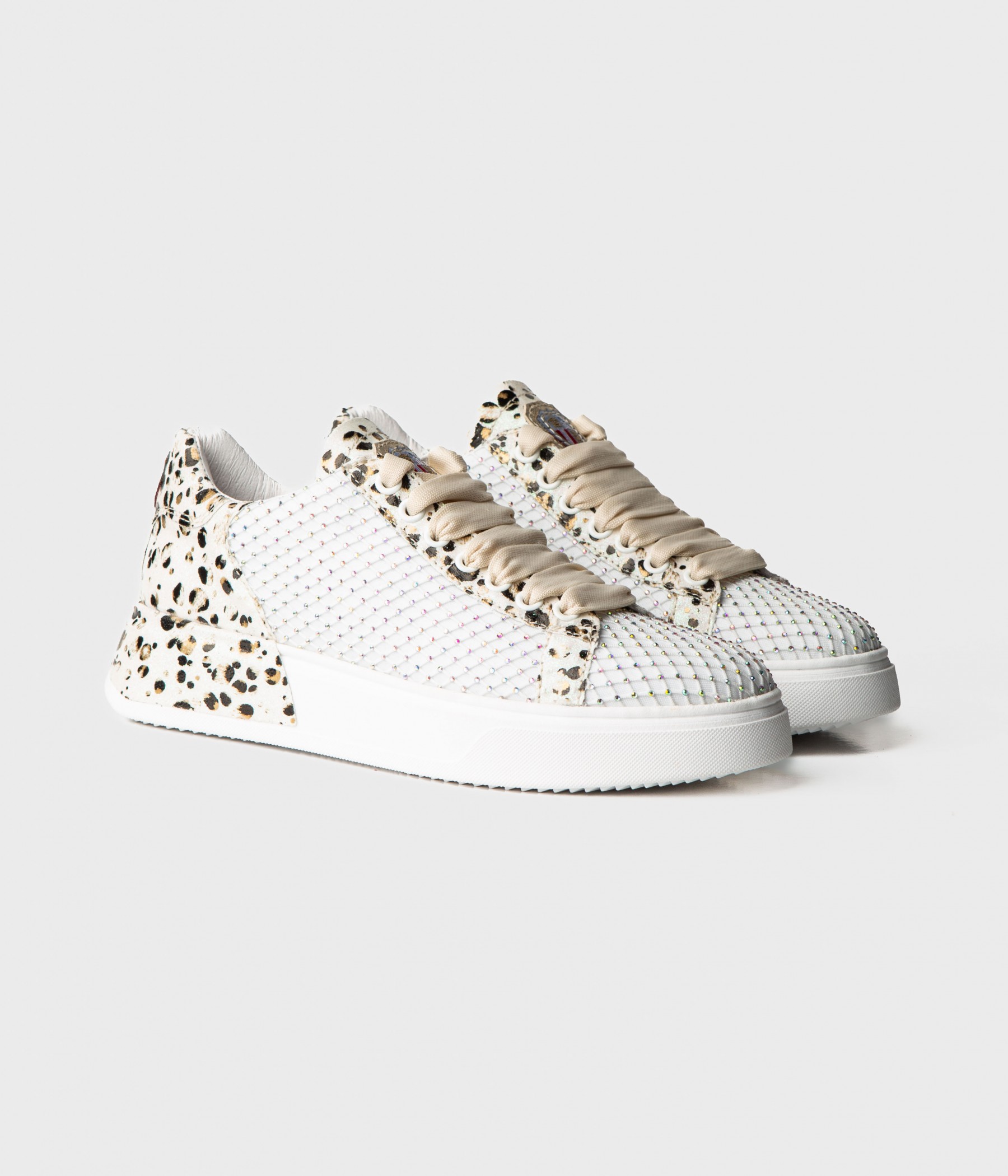 Queste sneaker combinano l'eleganza del crystal mesh bianco con l'audacia di dettagli animalier in tonalità neutre,