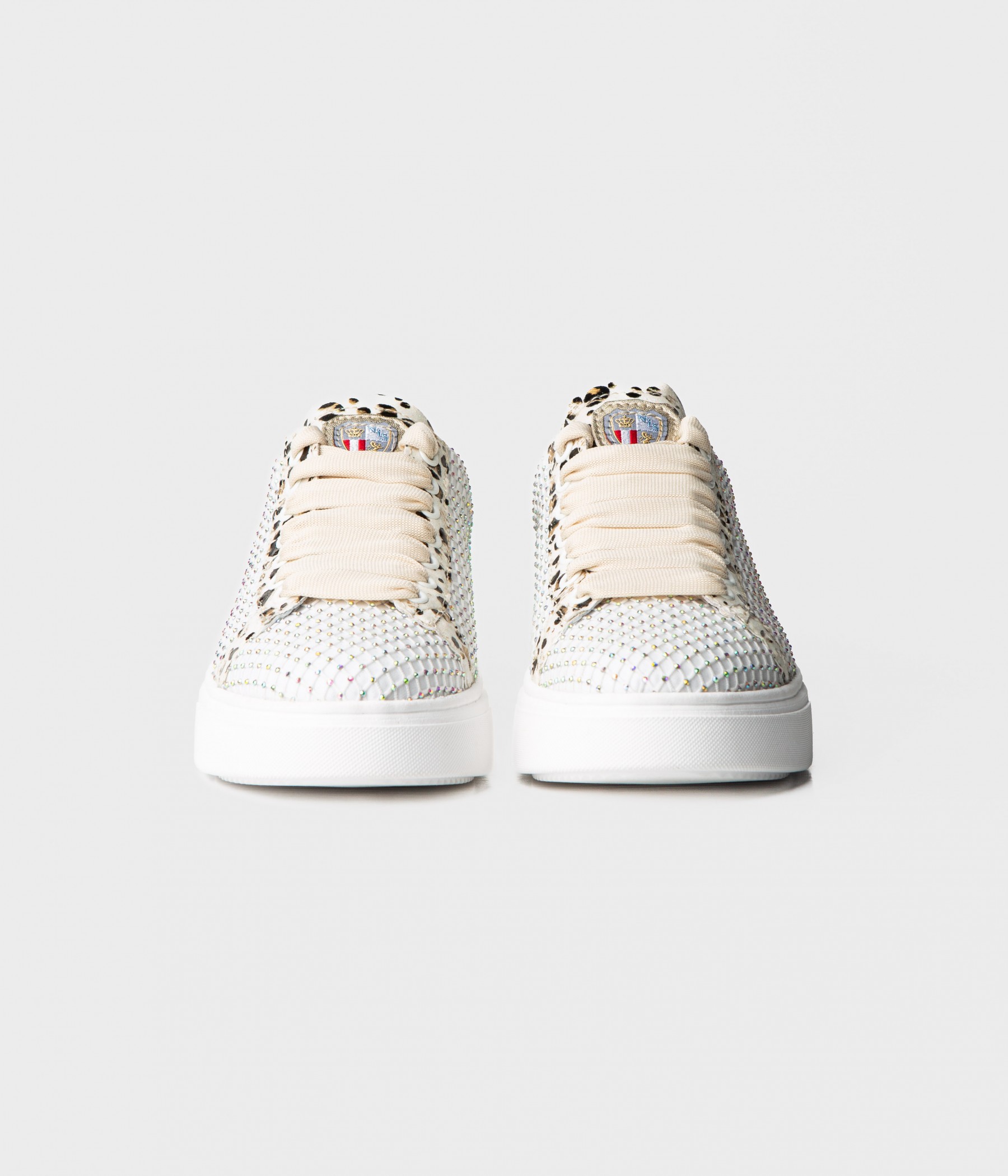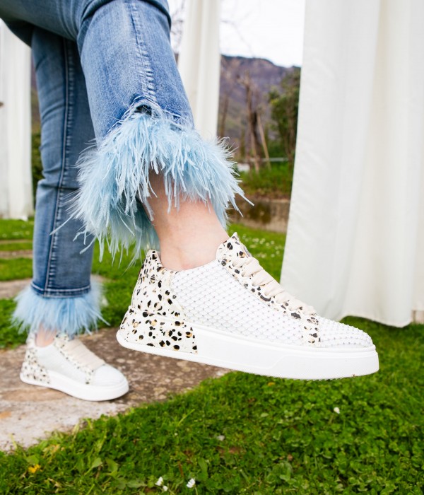 Sneaker in crystal mesh bianca con dettagli in tessuto glitter animalier.