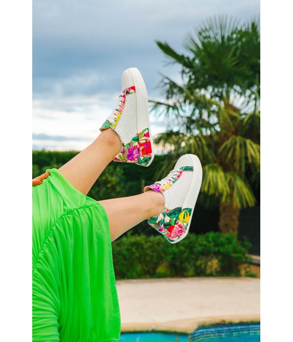 Queste sneaker combinano l'eleganza del crystal mesh bianco con l'intensità dei colori della pelle stampata a motivo floreale.