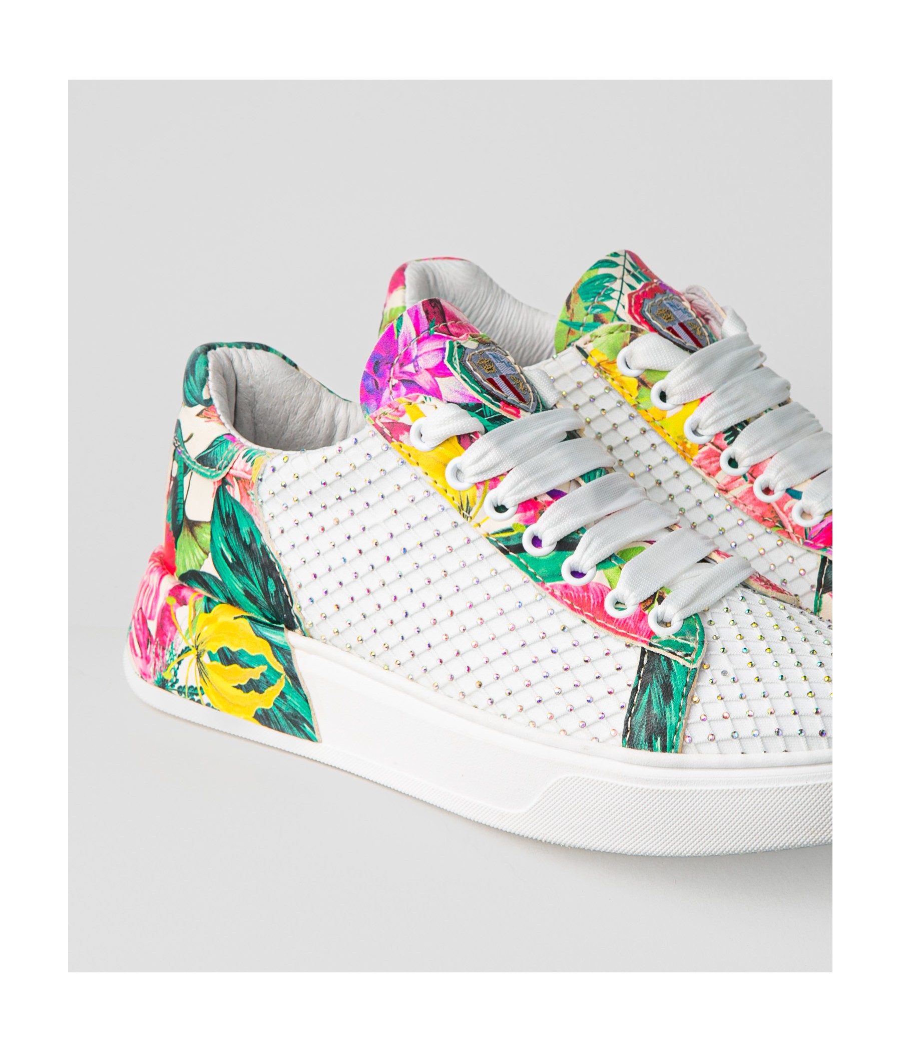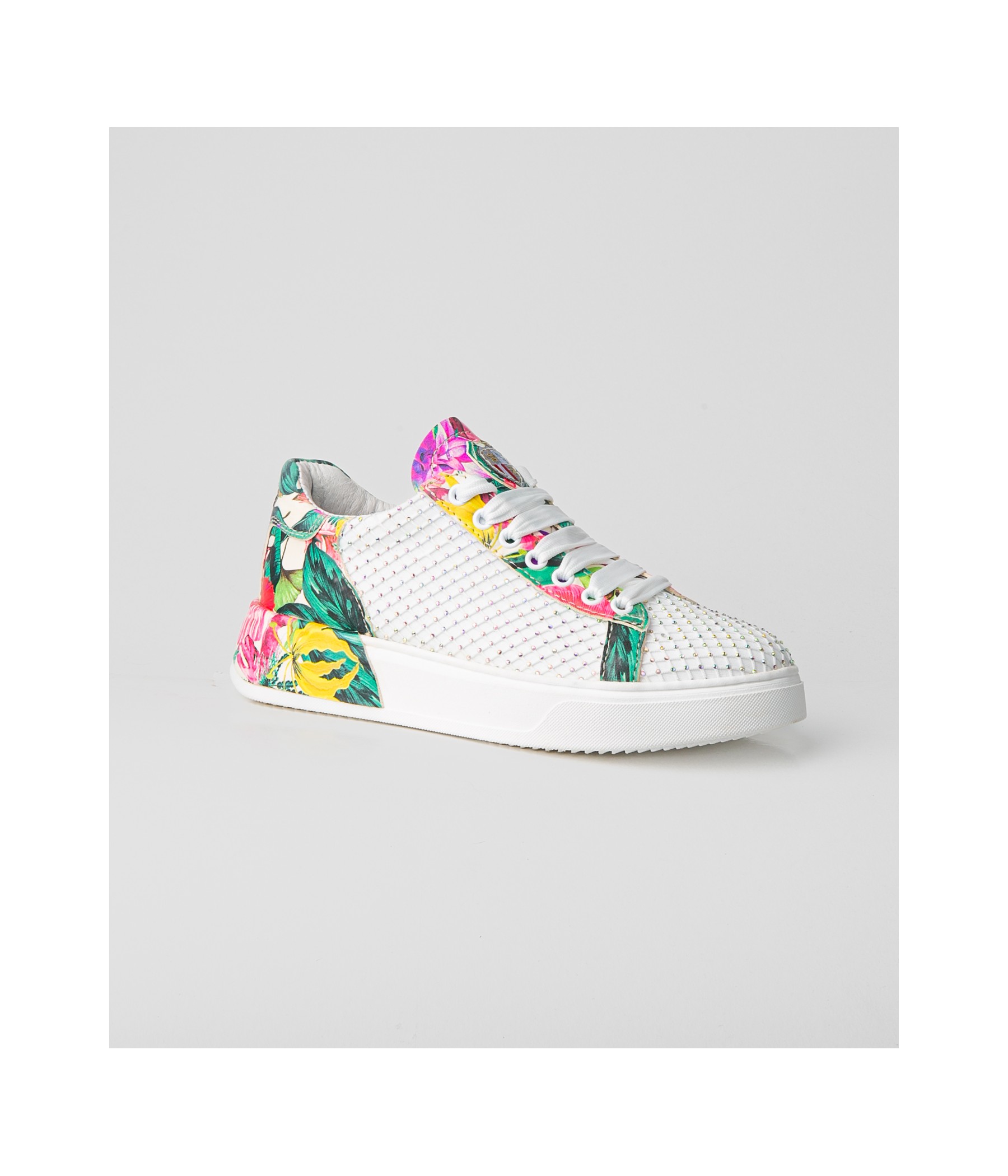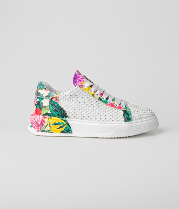 Sneaker in crystal mesh bianca con dettagli in in pelle stampata fantasia floreale.