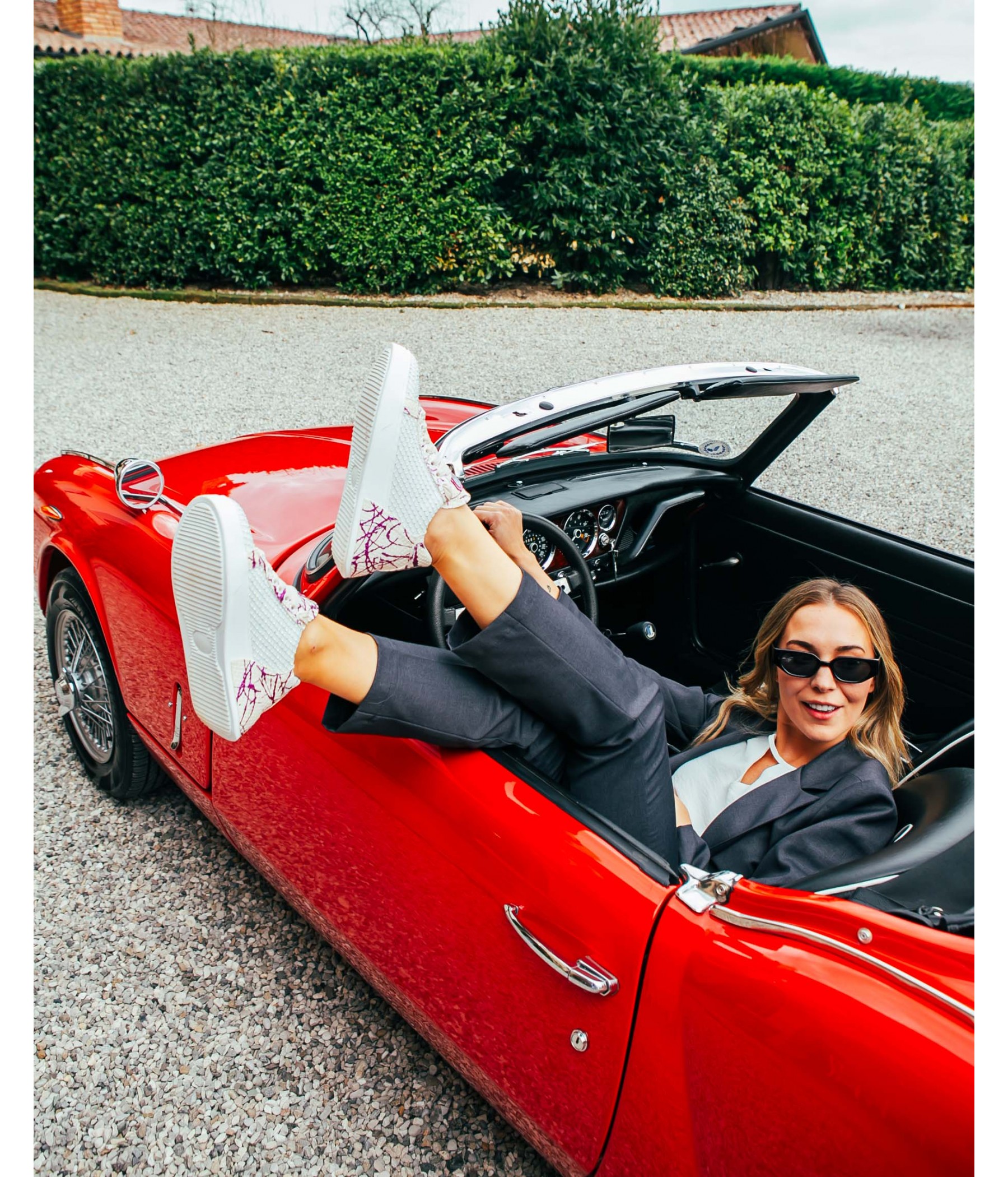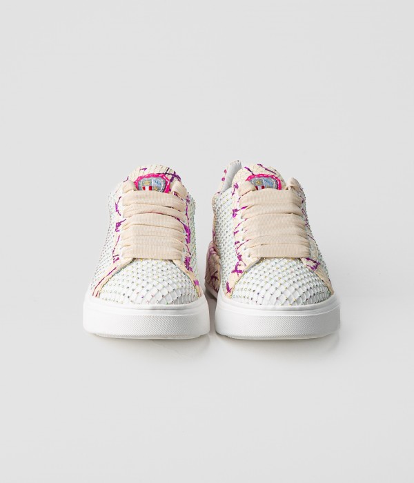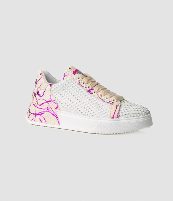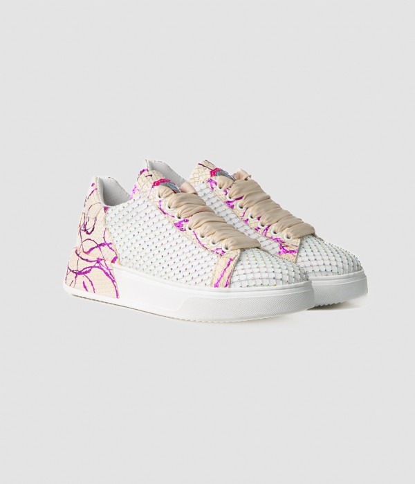 Queste sneaker combinano l'eleganza del crystal mesh bianco con una pelle stampata con un orignale motivo color avorio-fucsia.