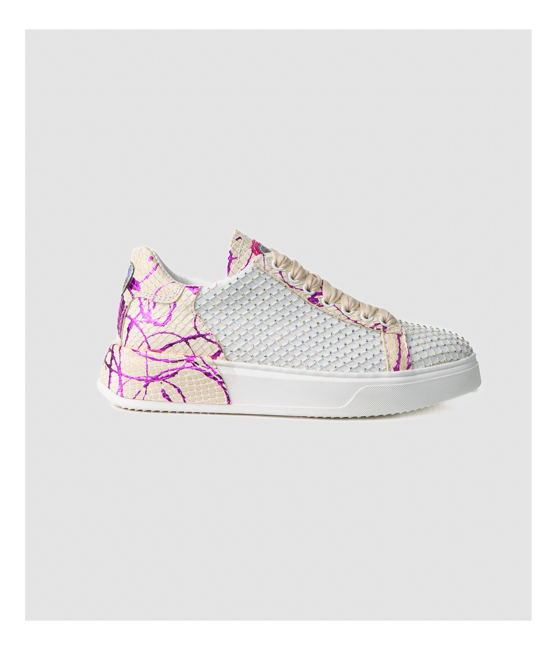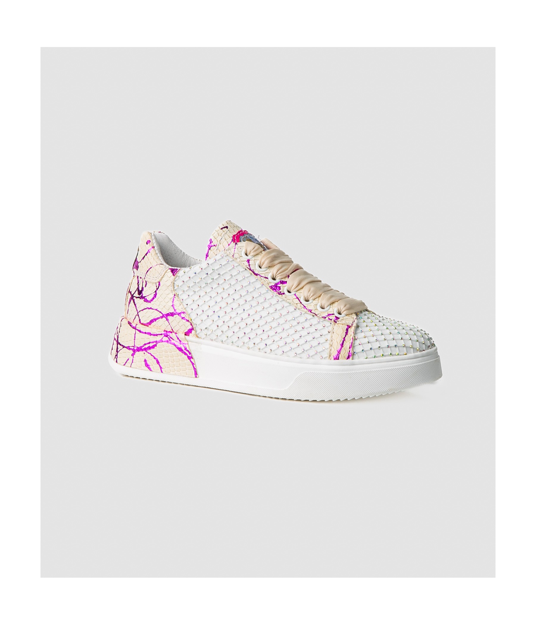 Sneaker in crystal mesh bianca con dettagli in pelle stampata avorio-fucsia.