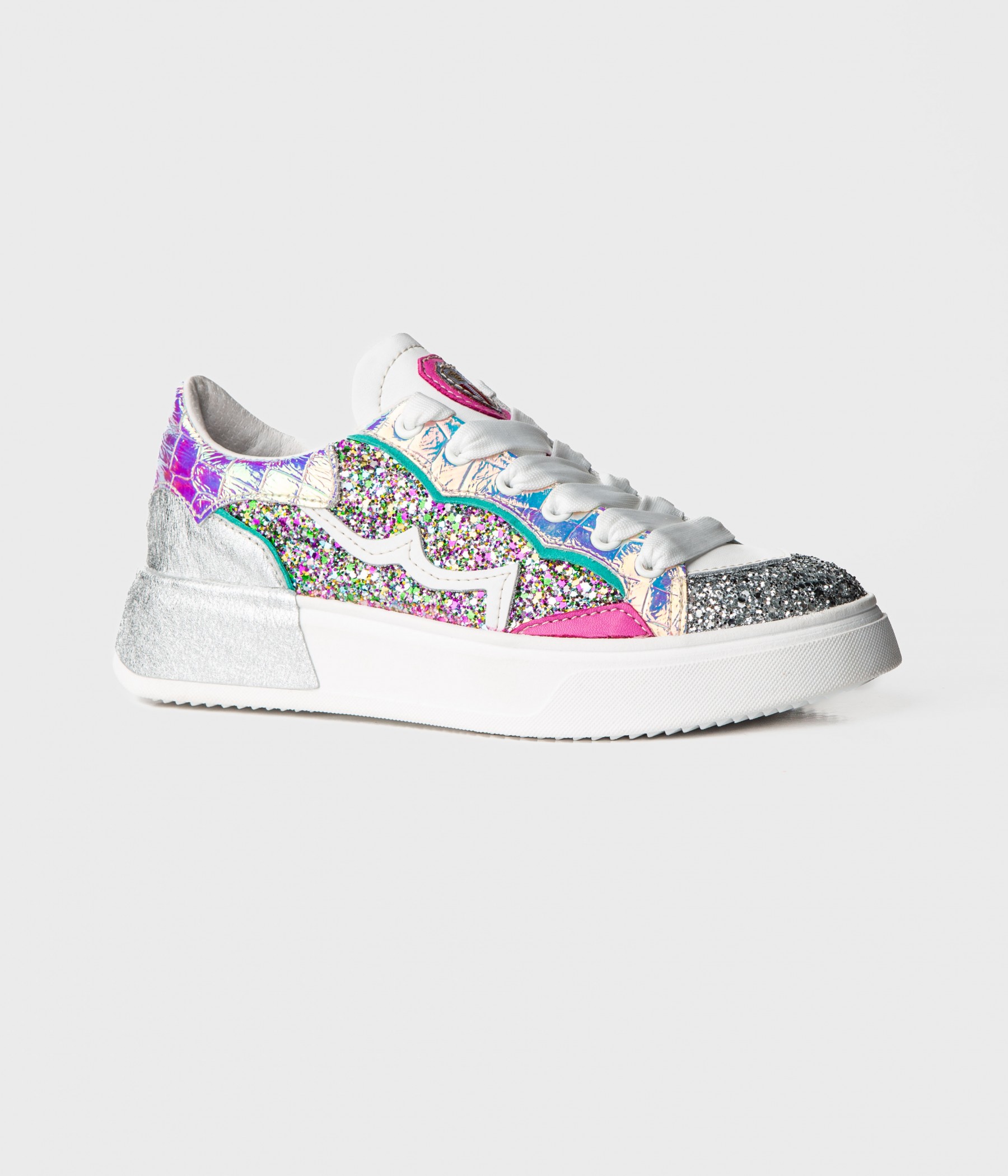 Sneakers in glitter multicolor con inserti in pelle rosa iridescente e dettagli laminati argento.